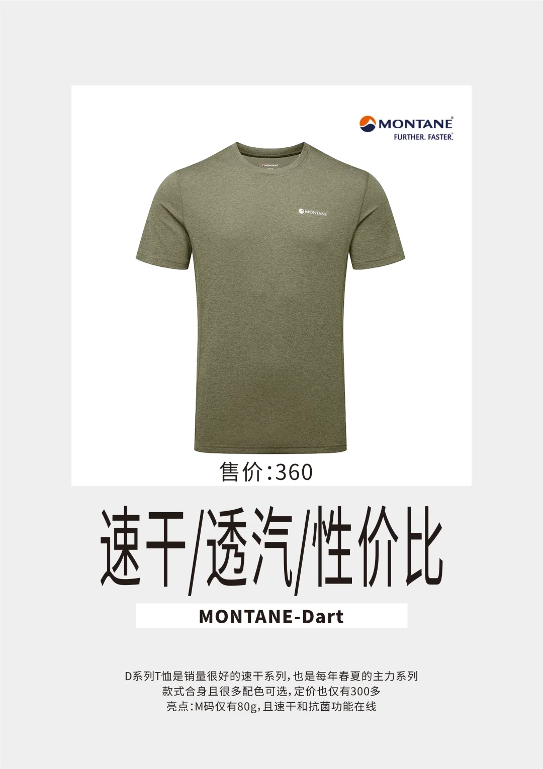 D系列T恤是销量很好的速干系列,也是每年春夏的主力系列,款式合身且很多配色可选,定价也仅有300多。亮点:M码仅有80g,且速干和抗菌功能在线