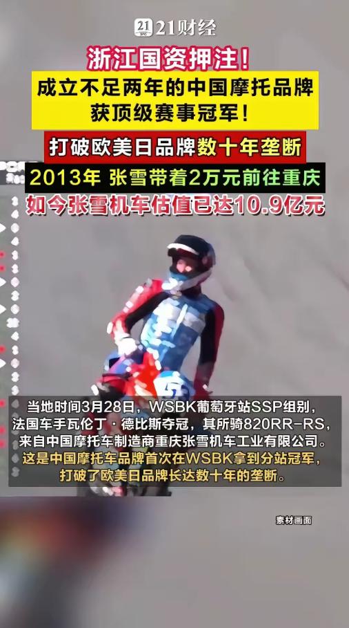 浙江国资委这次做梦都要笑醒,之前他们对张雪机车进行了9000万元的投资,可谁知不到两年,张雪机车就获得了顶级赛事的冠军。   2026年3月底,一则来自欧洲赛场的消息,让中国摩托车行业沸腾了。   在葡萄牙埃斯托里尔赛道举办的世界超级摩托车锦标赛上,一款来自中国重庆的赛车,硬生生从欧美日巨头手中抢下了冠军奖杯。   驾驶这款820RR-RS赛车的法国车手瓦伦丁·德比斯,连续两个回合冲线夺冠,用绝对优势改写了中国摩托在全球顶级赛事中的空白历史。   很少有人知道,这款创造奇迹的赛车,来自一家成立还不到两年的企业——张雪机车。   而更让人惊叹的是,支撑这家年轻企业站上世界之巅的,正是浙江国资委此前投入的9000万元。   说浙江国资委这次做梦都要笑醒,一点不为过,谁能想到,一笔不到两年的投资,竟然见证了中国摩托打破垄断的历史性时刻。   中国摩托车的发展,从来都不是一条坦途。   上世纪90年代,国产摩托也曾有过意气风发的日子,民用车型凭借高性价比,在东南亚市场一路畅销,成为当时中国制造业出口的一张名片。   可一场在越南市场的挫败,像多米诺骨牌一样引发连锁反应,整个东南亚市场失守,中国摩托车行业也随之陷入低谷,一蹶不振。   此后的几十年里,外界对中国摩托车的质疑从未停止,即便中国汽车行业实现了弯道超车,摩托车市场依旧被本田等外资品牌牢牢掌控,高端赛事更是成为欧美日品牌的专属舞台,国内企业连入局的机会都寥寥无几。   张雪机车的出现,像一束光,照进了中国摩托车行业的阴霾。   而这束光的背后,是创始人张雪二十年如一日的坚守。   出身湖南怀化农村的张雪,只有初中文化,十几岁就踏入社会,成了一名修车学徒,满身油污的日子里,他始终没放弃心中的摩托梦。   靠着一股不服输的韧劲,他曾创办凯越机车,从一个年销800台的小作坊,一步步做到年销3万台的行业黑马,积累了足够的技术和经验。   2024年,他选择放下过往的成绩,在重庆重新创业,以自己的名字命名成立张雪机车,决心打造属于中国的高端摩托品牌。   创业之路注定充满坎坷,张雪却有着自己的坚持——不搞投机取巧,深耕核心技术。   即便公司面临亏损,他也始终把研发放在首位。   2025年,张雪机车总产值达到7.5亿元,却亏损了2278万元,而这一年的研发投入就高达6958万元,占比超过9%。   这份不计短期得失的坚守,让张雪机车快速掌握了核心技术,也为后来的赛道夺冠埋下了伏笔。   与此同时,中国汽车行业的快速发展,带动上下游产业链不断完善,也为张雪机车提供了技术和供应链上的支撑,让这个年轻的品牌得以快速成长。   真正让张雪机车加速崛起的,是浙江国资委的精准押注。   2026年3月初,张雪机车完成A轮融资,9000万元的资金顺利到账,而这笔资金的背后,正是浙江国资委旗下的投资机构。   此次融资后,张雪机车的估值直接达到10.9亿元,更让人惊叹的是,浙江国资旗下机构3月6日正式入股,距离张雪机车夺冠仅仅过去了23天。   这样精准的投资节奏,不仅体现了浙江国资对中国高端制造的信心,更彰显了其独到的投资眼光。   能在世界超级摩托车锦标赛上夺冠,绝非偶然。   这项与MotoGP齐名的全球顶级赛事,有着极为严苛的规则——所有参赛车辆必须以市售量产车为蓝本,仅能进行有限度的改装,考验的是车企最核心的量产实力。   张雪机车的820RR-RS赛车,能在众多欧美日顶尖车型中脱颖而出,靠的就是过硬的动力、稳定的性能和专业的调校,这也是中国摩托车核心技术实力的最好证明。   夺冠的消息传回国内,市场的热情瞬间被点燃。   3月30日当天,张雪机车官方旗舰店的直播间涌入了6000多名车友,咨询订车的留言刷个不停,客服根本来不及一一回复。   官方推出的定制周边,刚上架就被一抢而空,线下门店的咨询电话也从早响到晚,不少车友甚至熬夜打电话订车,这份热情,是对中国摩托实力的最好认可。   与此同时,资本市场也给出了积极反馈,宏昌科技迎来20cm一字涨停,鸿泉技术股价大幅上涨,用最直接的方式为中国摩托的胜利喝彩。   当然,一场赛事的胜利,只是张雪机车发展路上的一个起点。   外界也有不少理性的质疑,有人担心,9000万元的融资,能否支撑公司完成全球认证、供应链升级以及海外售后体系的搭建。   毕竟在行业内,不乏一些品牌靠赛事成绩造势,却在量产和服务上掉链的例子。   大家都清楚,赛事冠军只是进入市场的敲门砖,稳定的现金流、完善的量产体系和售后服务,才是企业长期发展的根本。