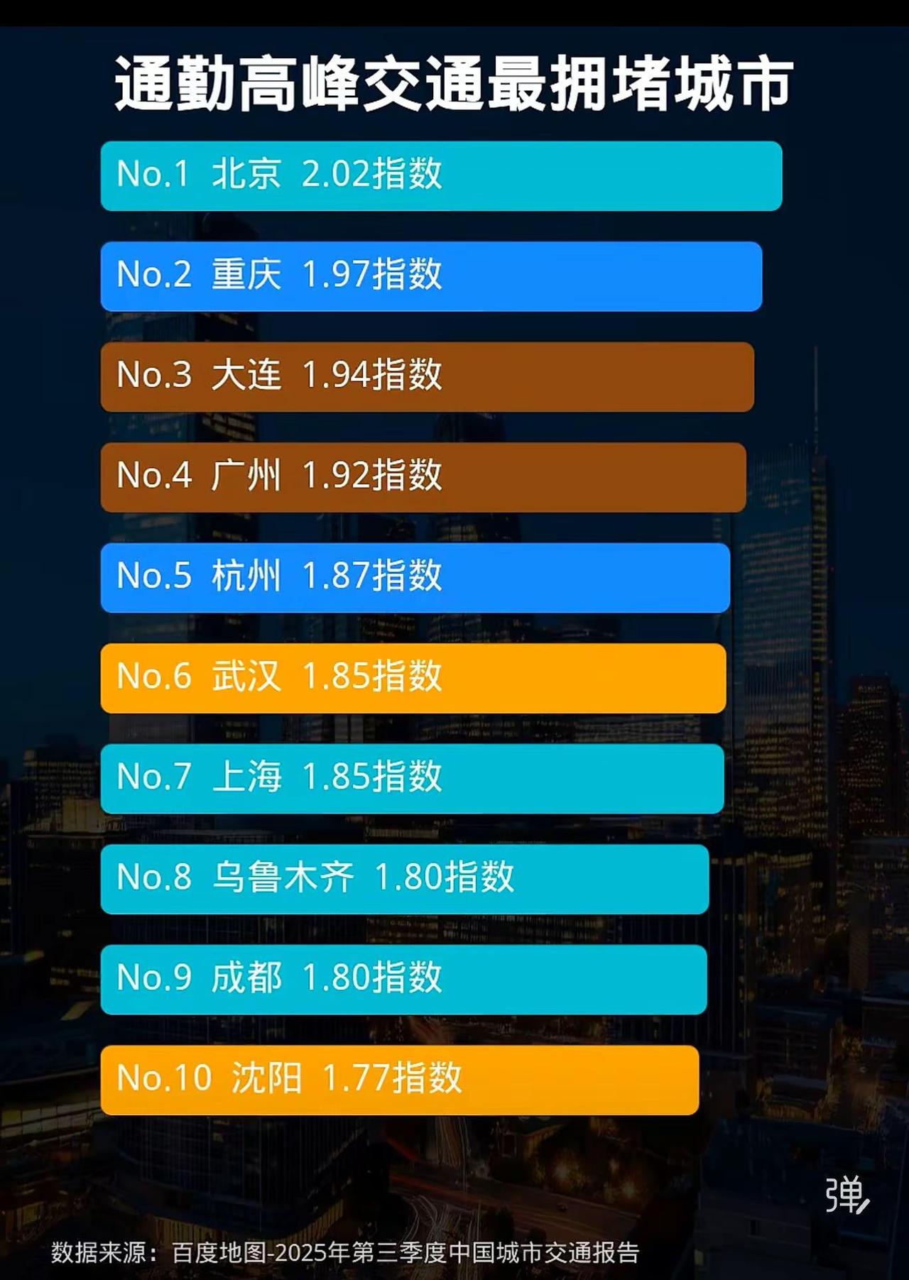 呈现百度地图发布的2025年第三季度中国城市通勤高峰交通拥堵指数排名前10的城市