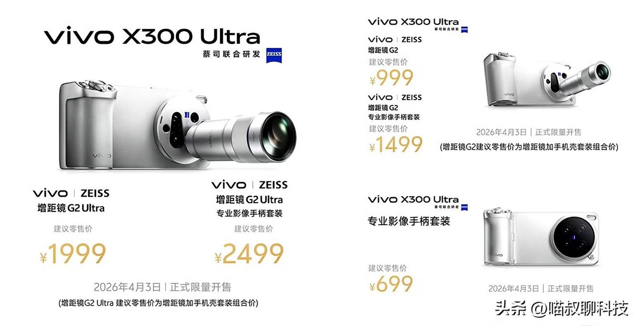 现在的新机只适合看看而已了... 内存涨价确实是既定事实,但大几千的旗舰也有必要这么涨售价吗? 最新发布的vivo X300 Ultra 这定价感受如何? 12G+256GB —— 6999元 12G+512GB —— 7499元 16G+512GB —— 7999元 16G+1TB —— 8999元 16G+1TB 摄影师套装 —— 11999元 作为主打拍照的机型,256G的内存肯定是不太够用的,作为超大杯旗舰,不上16G运存也不太说的过去,所以主选配置的售价直接来到了7999,想要升级到1T又要再加价1000块,现在这内存是真用不起~ 不过有一说一, X300 Ultra的影像配置还是挺值得肯定的。 主摄升级到了2亿像素的LYTIA 901;长焦略有升级,改为了依旧是2亿像素的三星HP0;三摄的防抖也均有提升;另外还新增搭载了一颗500万像素蓝图原色摄像头,12光谱通道;可外挂200mm和400mm两款蔡司增距镜。 支持全焦段直出2500万像素照片,可实现全焦段4K 120fps杜比视界拍摄。 搭配上外挂蔡司增距镜,作为演唱会神器应该是相当的香~