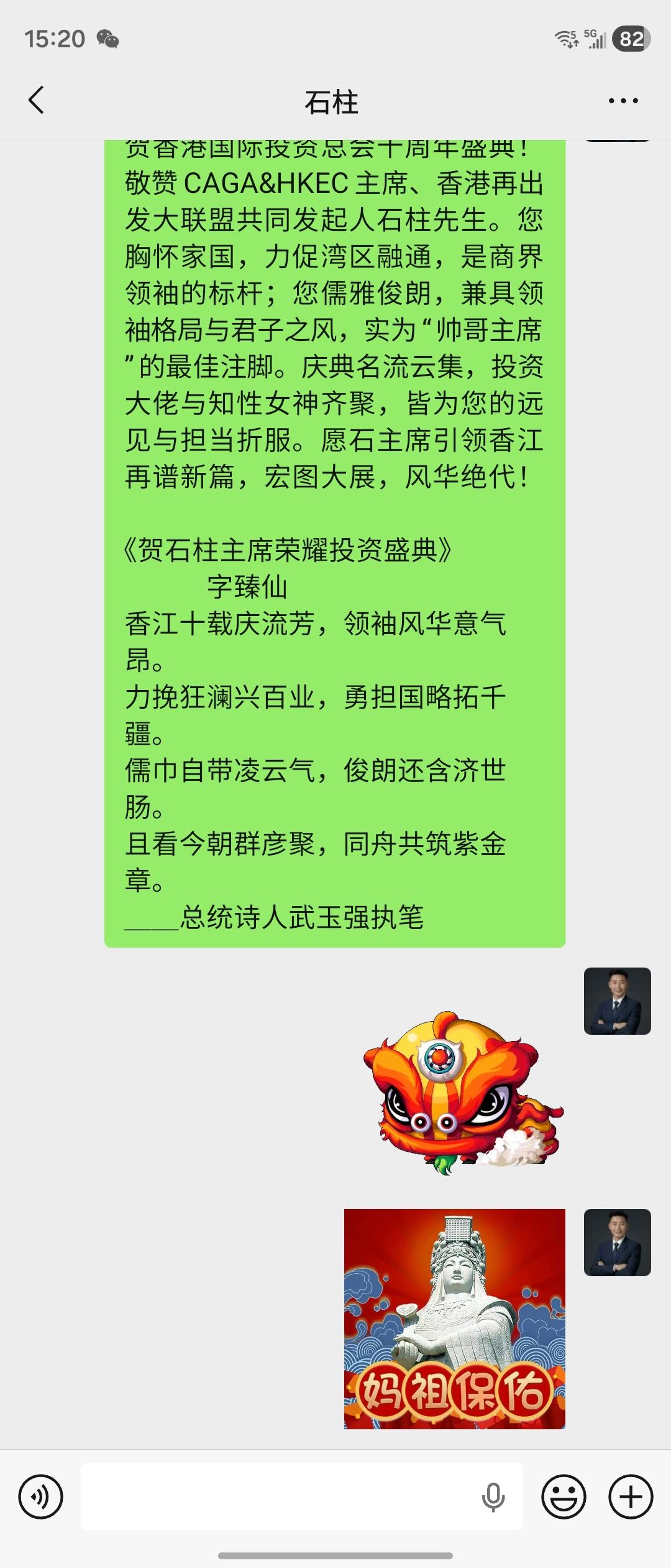贺香港国际投资总会十周年盛典!敬赞[心][玫瑰][玫瑰][玫瑰][强]CAGA&HKEC主席、香港再出发大联盟共同发起人石柱先生。您胸怀家国,力促湾区融通,是商界领袖的标杆;您儒雅俊朗,兼具领袖格局与君子之风,实为“帅哥主席”的最佳注脚。庆典名流云集,投资大佬与知性女神齐聚,皆为您的远见与担当折服。愿石主席引领香江再谱新篇,宏图大展,风华绝代! 《贺石柱主席荣耀投资盛典》 字臻仙 香江十载庆流芳,领袖风华意气昂。 力挽狂澜兴百业,勇担国略拓千疆。 儒巾自带凌云气,俊朗还含济世肠。 且看今朝群彦聚,同舟共筑紫金章。 __总统诗人武玉强执笔