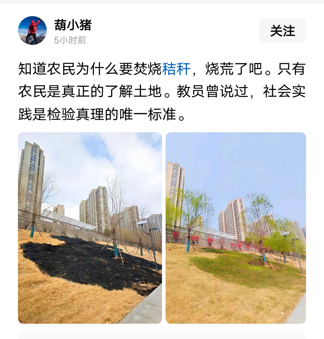 烧荒养地:老祖宗传下的土地智慧 这组对比图,直观印证了一个流传千年的农耕真理:烧荒后的土地,长势就是肉眼可见的好。 这是因为,焚烧产生的高温,能直接杀灭土壤里越冬的虫卵、病菌与杂草种子,从根源上减少病虫害,为新草萌发扫清障碍;草木灰更是天然的钾肥,能快速补充土壤肥力,让土地变得疏松肥沃,这是任何化学肥料都难以替代的天然滋养。 正所谓“离离原上草,一岁一枯荣,野火烧不尽,春风吹又生”。这从来不是夸张,而是土地最本真的循环规律。 农民世代遵循的烧荒习俗,并非盲目破坏,而是对土地最深刻的理解。在没有农药化肥的年代,正是这一把火,完成了土地的“新陈代谢”,让枯败的草木化作滋养新生的养分,让土地年年焕发生机。 所谓实践出真知,农民在土地上摸爬滚打的经验,远比书本理论更有说服力。烧荒养地,是人与自然的默契共生,是刻在农耕文明里的生存智慧,也再次印证了:真正懂土地的,永远是世代耕耘的农民。