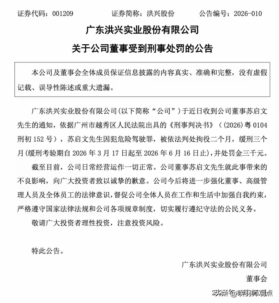 A股董事危险驾驶被判刑!公司紧急道歉,投资者懵了 3月30日,洪兴股份公告,公司董事苏启文因危险驾驶罪被判处拘役二个月、缓刑三个月,罚金3000元。而就在2024年,他刚因配偶短线交易收到警示函。 法律专家指出,危险驾驶罪已触刑法,缓刑不等于“没事”,犯罪记录将影响任职资格。公司治理专家表示,高管“二次踩雷”暴露了公司内控与合规文化的深层缺失。 事实上,苏启文案并非孤例。凯格精机、山外山、元道通信等多家A股公司均有高管因酒驾被判刑。古人云:“其家不可教而能教人者,无之。”连基本法律底线都守不住,投资者如何相信你能管好一家公司? 高管屡次“踩雷”,是个人问题还是公司管理问题?留言聊聊你的看法。杭州危险驾驶罪