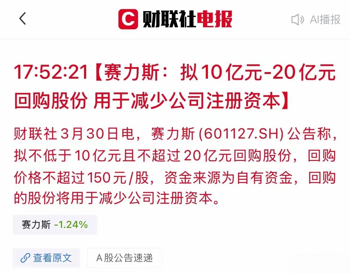 赛力斯直接给出了双王炸,利润大幅增长取决于华为合作,这一次又拿出大额的资金作为回购,减少资本注册,对于赛力斯的成功,领导层决策能力非常果断,第一个与华为合作吃螃蟹的企业!让这家企业发生了巨大的变化!也让中国新能源汽车出现了重新定位!确实有华为作为支撑,赛里斯才有今天的成就!