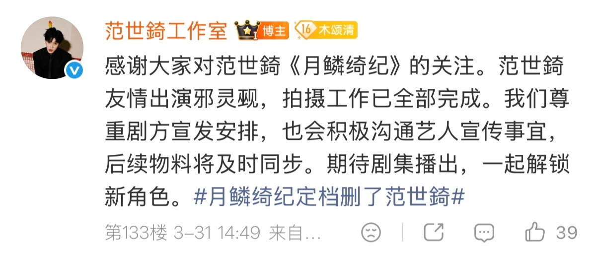 工作室回应🈶工作室回应范世錡定档被删除范世錡方回应被月鳞绮纪定档删除