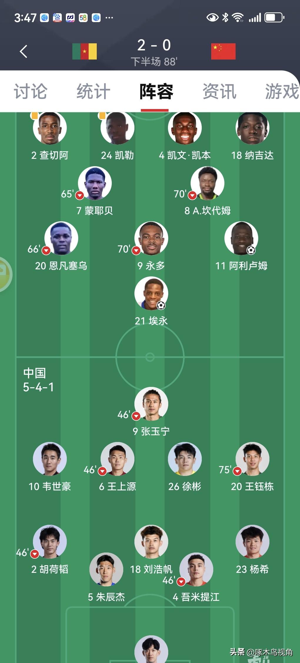 国际足球澳大利亚系列赛,中国队对阵非洲雄狮喀麦隆。中国队世界排名第92位,喀麦隆世排名45位。两队没有交手记录。 传说喀麦隆队总身价是中国队的20倍。即使本场对中国队首发11人全部换成替补,平均年龄只有21.9岁,但首发阵容身价比仍然将近1/7。 但近期中国足球总体势头强劲,尤其是战胜库拉索之后,早就对本场比赛跃跃欲试了。虽然足球是圆的,有很多不确定性,但归根结底还是要用实力说话的。 比赛第三分钟对手就取得了闪电进球,仅仅7分钟之后对方又利用角球机会,完成第二次破门。十分钟不到,中国队连丢两球。当时的第一感觉就是被人狠狠抽了两耳光,一下子回到了现实。 最可怕的是我们挨了两连鞭之后,你说不出来我们具体哪里犯了错?没有偶然,完全是必然。 就是实力差距,全方位的。包括教练战术布置,球队整体意识,球员单兵作战能力。没有一点可比性。 回想起赛前有人还分析条条是道,说这是历史最有可能战胜喀麦隆的机会。因为这是他们最弱的首发阵容,而中国队则是势头正盛的阶段。还有人幻想夺冠呢。 现在想想我们还是不认识我们自己。人们常常骂安东尼奥的战术丑陋,但我还真的很佩服他的,因为他知己知彼,并能制定合理的战术。关键是他会运用这些战术,他真的会防守。我们今天这5—4—1最终就是个摆设,不是后防线人多就是会用防守战术。
