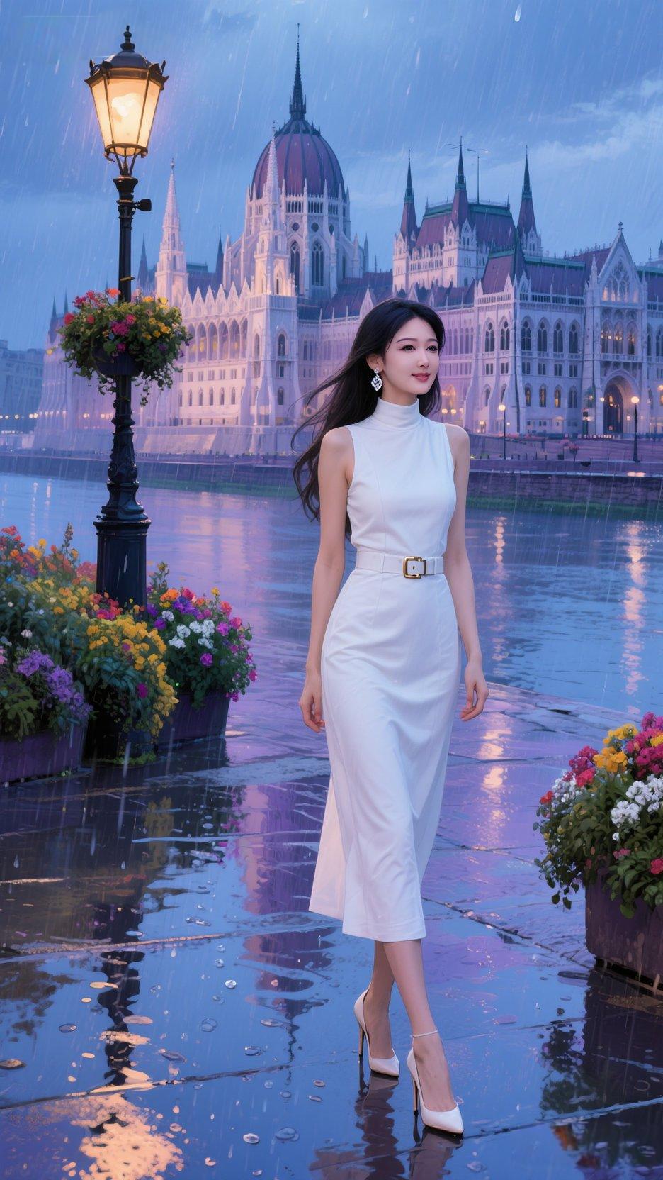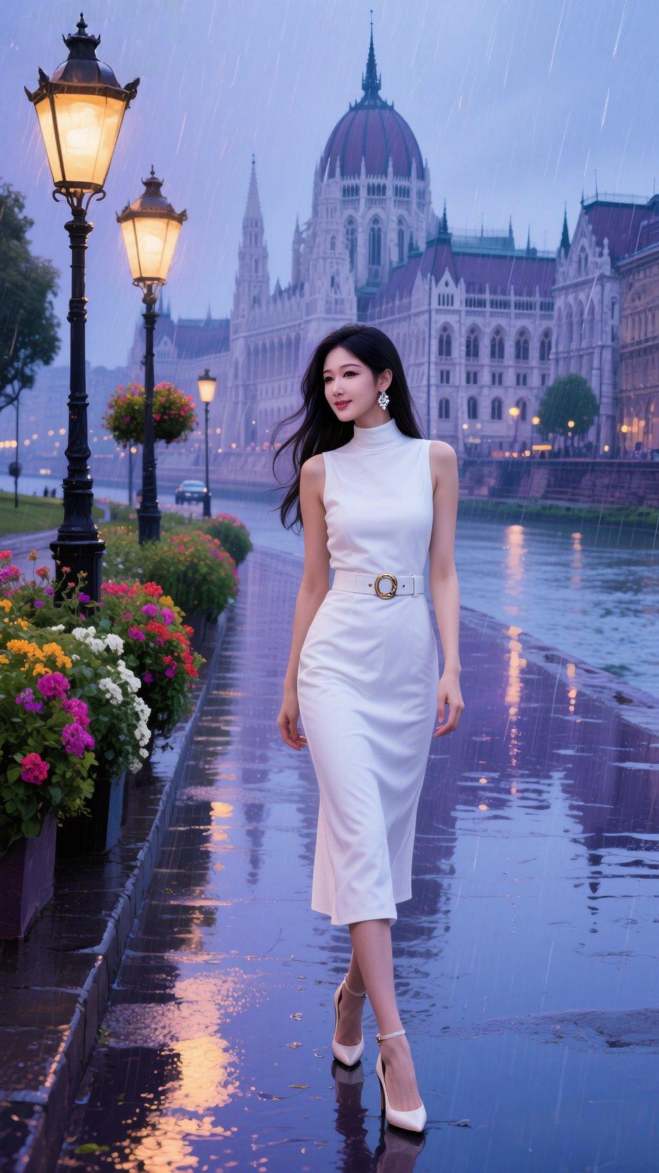 雨中漫步,优雅白裙,梦幻夜景,唯美如画