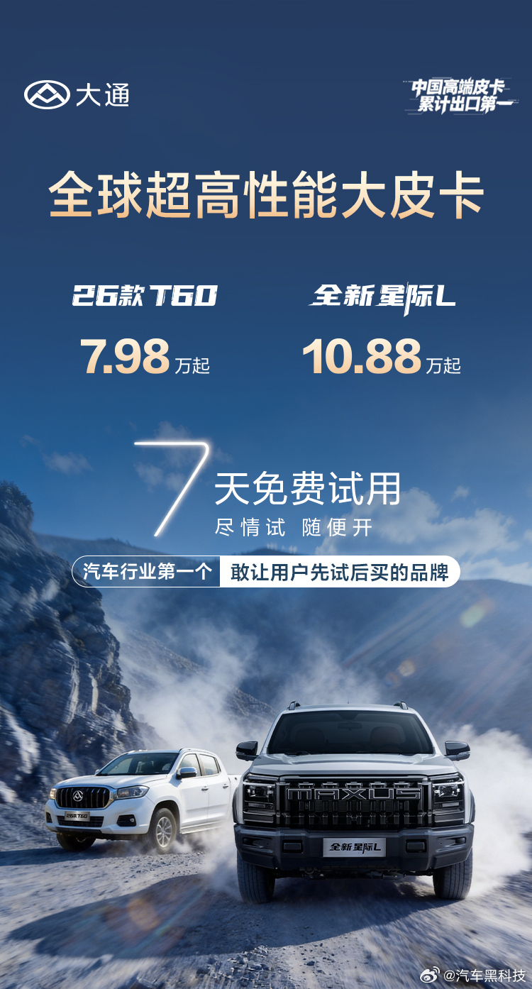 大通全新星际L上市7.98万元起,上汽大通全新T60这个价格太惊喜了!此外同步亮相的星际L车型,官方指导价也仅10.88万元起,在这个价位给到2.5T动力、3吨多的拖拽能力,外加7横2纵大梁+博格华纳四驱,简直诚意拉满。机甲风的炫酷外观搭配熏黑轮毂,颜值在线,应该没有哪个男人能拒绝得了吧。重载稳、越野强、外观酷、品质硬!大通无愧高端皮卡出口第一企业,家用拉货两不误,谁能不爱。