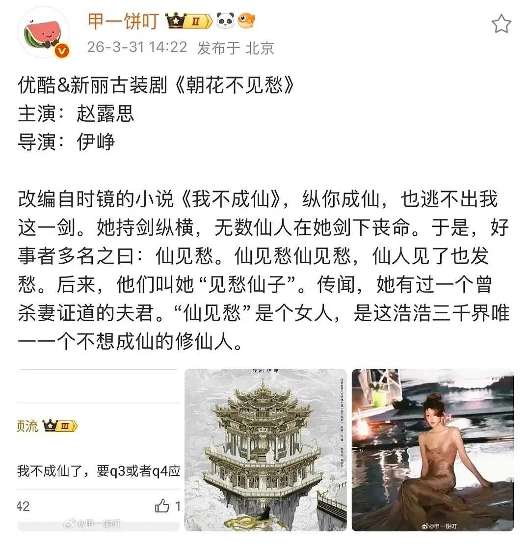 我不成仙是赵露思的吗?如果是的话希望她能强势一点护住大女主的人设剧情戏份,不要像小说一样拍出大男二膈应人