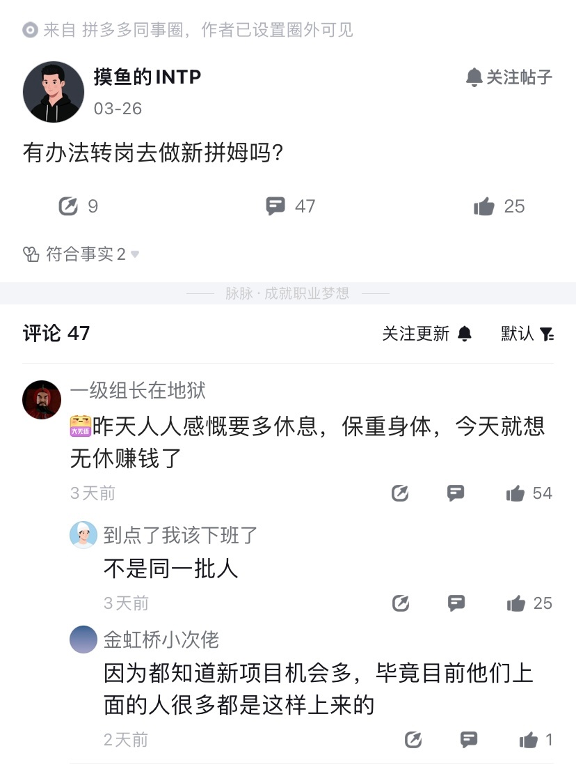 新拼姆成公司内部升职跳板了,已经有拼多多员工在打听怎么转岗的事,整个评论区也都在“蹲”。