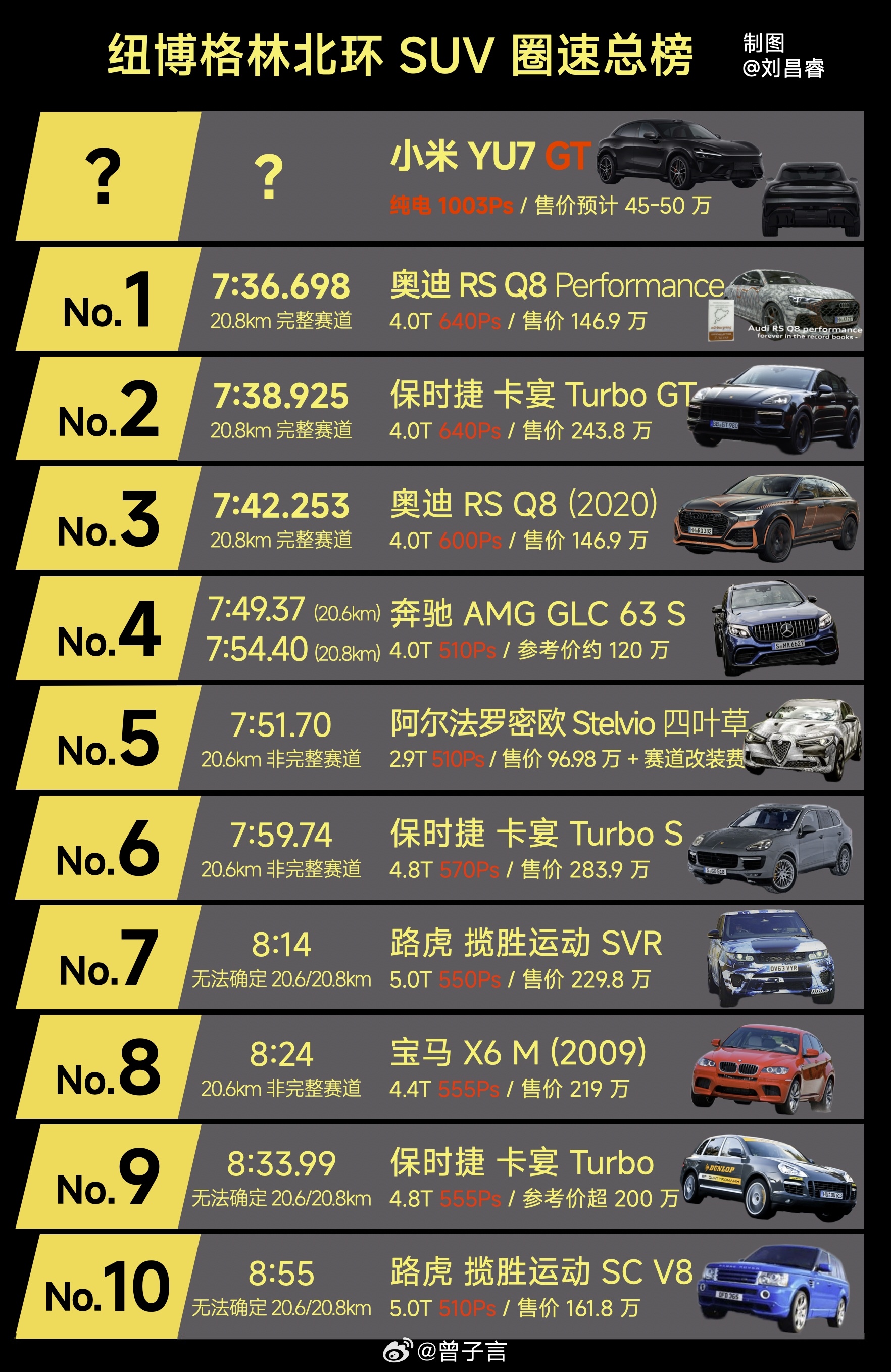 其实这台车从去年就在纽北持续打磨测试了,千匹马力的底子,摆明了奔着 SUV 圈速榜去的。现在纽北 SUV 圈速纪录是 7 分 36 秒 6,要是能冲进 7 分 35 秒内,怕是又要上演 50 万级车型硬刚百万豪车的名场面了。