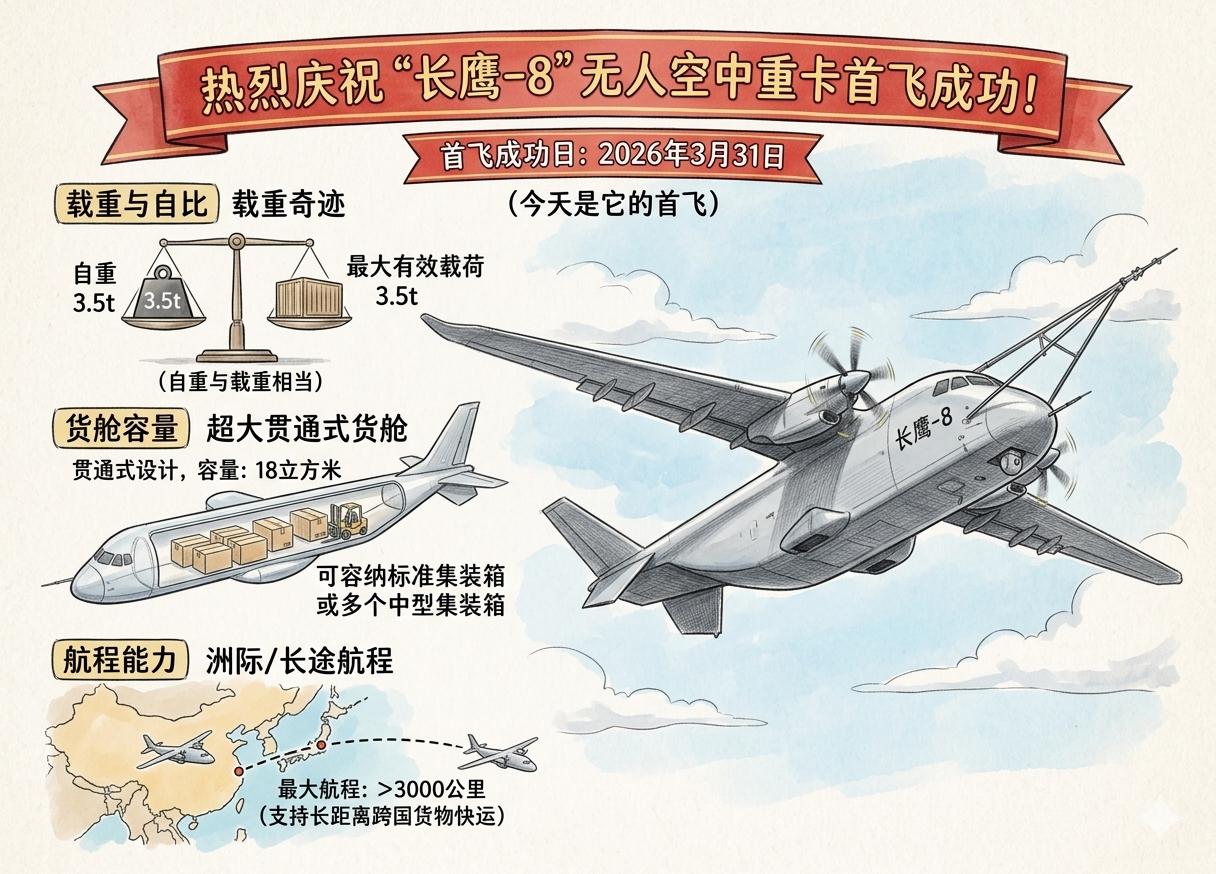 长鹰-8是中国自主研发的7吨级大型固定翼运输无人机,被誉为我国首款“无人空中重卡”。 该无人机于2026年3月31日在郑州上街机场成功完成首飞,成为全球迄今首飞的最大货运无人机。此次首飞通过滑跑起飞,历时约30分钟,顺利验证了智能飞控、航电、机电、动力燃油以及飞行品质等关键系统,飞行姿态稳定,各系统工作良好。 机身尺寸:机长17米,翼展25米,高度接近5米。 货舱容量:18立方米超大贯通式货舱,支持前后双舱门布局,可兼容多型标准航空集装箱、专业冷链运储箱等。装卸时间最快可在15分钟内完成,大幅提升物流周转效率。 重量与载重:起飞重量7吨,最大有效载荷3.5吨(自重与载重各约3.5吨)。例如,可一次性装载1700余件御寒棉服或700顶救灾帐篷。 航程与性能:最大航程超过3000公里(相当于从北京直飞乌鲁木齐无需加油);最大飞行高度超过1万米;具备高原起降能力和短距起降特性(最短滑跑距离约200米,起降距离小于500米),可适应简易土跑道、高原、海岛等复杂地形。 长鹰-8的成功首飞,标志着中国在大型无人货运航空领域的重大突破。它不仅体现了国产大型无人机的重载、长航程与复杂环境适应能力,也为低空经济规模化应用提供了重要技术验证。相较于传统有人运输机或小型无人机,该平台在成本效率、无人化自主性和全域部署灵活性上具有显著优势。