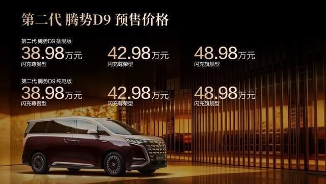 比亚迪重磅新车!第二代腾势D9开启预售,38.98万起,又要火了 3月29日,第二代腾势D9正式开启预售,作为科技豪华旗舰MPV,这款车迎来了全方位升级,预售价格区间在38.98万-48.98万,诚意十足。 现在下订还能享受超值福利,原本1年的免费闪充,再额外赠送6个月,总共能享18个月免费闪充,日常用车更省心省钱。 新款腾势D9保留了经典的优雅设计,全新前脸造型大气,金属羽翼质感十足,不管是商务接待还是家用,都很有格调。车内用料更为高端,全车用上NAPPA真皮座椅,做工精致、触感细腻。中排升级为零压云绒座椅,柔软度和包裹性拉满,再加按摩、电动调节功能,坐上去就像头等舱一样舒服。副驾还配有开合智能屏,能听歌看视频,翻下来还能当小桌板收纳小件物品,细节很贴心。 核心技术方面,新车搭载比亚迪第二代刀片电池,性能大幅提升。插混版本纯电续航能到401km,日常代步、短途出差全程用电不用烧油,纯电版本续航更是高达800km,长途出行完全不用慌。而且闪充速度超快,5分钟充好、9分钟充饱,就算零下30℃低温,充电也只慢3分钟,喝杯咖啡的功夫就能补能完毕。 智能配置也没落下,新车全系标配天神之眼5.0辅助驾驶系统,依托海量数据不断优化,开车、停车都比老司机更稳更精准,出行安全感拉满。 这款车从整体的外观、内饰,到动力、智能,全维度进化,商务够排场,家用够温馨,远行无顾虑。目前只是开启预售,更多惊喜配置和细节,会在上市发布会正式公布,值得期待。【来自懂车帝车友圈】