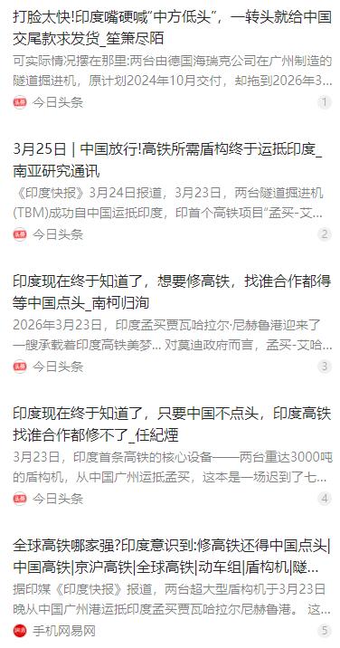 中方终于做出让步了! 最近几天,印度媒体那边可谓是一片欢呼雀跃,全都在报道一件事——两台大型盾构机,终于从中国广州港出发,顺利运抵了印度孟买港。不少印度媒体直接用“中方终于让步”来形容这件事,语气里的兴奋劲儿,隔着屏幕都能感受到。 麻烦看官老爷们右上角点击一下“关注”,既方便您进行讨论和分享,又能给您带来更多优质的内容,感谢您的支持! 最近几天,印度媒体可谓一片欢腾,各大版面都在聚焦同一件事 —— 两台巨型盾构机,从中国广州港出发,顺利抵达印度孟买贾瓦哈拉尔・尼赫鲁港。不少印媒直接用 “中方终于让步” 定调,字里行间的兴奋,隔着屏幕都能感受到。 2026 年 3 月 23 日深夜,两艘货轮缓缓靠泊孟买港,船上装载的两台 “钢铁巨兽”,正是印度首条高铁 —— 孟买 - 艾哈迈达巴德高铁项目的核心装备。这两台盾构机由德国海瑞克公司设计,却实打实是在广州完成生产制造的,单台重量达 3000 吨,开挖直径 13.65 米,是印度目前引进的最大规格盾构机。 它们的到来,对印度高铁项目意义重大。孟艾高铁全长 508 公里,孟买段有 27.4 公里隧道,其中 7 公里是海底隧道,地质条件极其复杂,没有这种超大直径混合式盾构机,隧道掘进根本无法推进。可以说,这两台设备就是项目的 “心脏”,缺了它们,整个工程都得停摆。 但这份 “喜悦”,印度人等了太久。按照最初计划,这两台盾构机本该在 2024 年 10 月就交付印度,可直到 2026 年 3 月才到港,硬生生在广州港滞留了一年多。即便退一步说,2025 年 9 月曾计划再次发运,也未能成行,最终延误近半年。 滞留的原因,并非印媒渲染的 “中方刻意刁难”,而是两个实打实的问题。一方面,印度国家高铁公司迟迟未按合同结清尾款,海瑞克公司坚持 “尾款到账再发货” 的商业规则,双方一度陷入僵局。 另一方面,也是更关键的一点 —— 这两台盾构机搭载了稀土永磁电机,属于 2024 年 11 月中国更新后的《两用物项出口管制清单》中的敏感技术。中方必须严格审查,确保设备仅用于民用隧道施工,这是合规出口的必要流程。 过去几年,中印关系整体降温,印度一边不断加强对中资和中国设备的采购审查,试图推行 “去中国化”,一边却在高端工程装备上,不得不依赖中国制造。 盾构机技术门槛极高,全球能稳定量产超大直径型号的,只有中德等少数国家。欧洲、日本企业要么产能不足,要么交货周期太长,根本无法满足印度高铁项目的紧急需求。印度绕了一大圈找德国企业,最终还是绕不开中国的生产基地。 盾构机滞留的这段时间,印度高铁项目陷入了巨大困境。隧道工程全面停摆,施工队伍闲置,大量辅助设备白白损耗,每天都要承担巨额资金成本。据统计,项目总投资 129 亿美元,停工一天就损失约 200 万卢比,半年累计损失超过 30 亿卢比。 印度媒体对此焦虑不已,频繁报道项目延期的消息,一边抱怨 “中方扣押设备”,一边渲染印度在关键技术上的 “依赖风险”。甚至有印媒直言,没有中国的盾构机,印度的高铁梦就是空谈。 面对越来越大的工期压力和经济损失,印度最终不得不放下姿态。先是足额结清了拖欠已久的尾款,随后又按照中方要求,提交了详细的最终用户证明和技术用途说明,主动配合完成所有合规审查流程。 在印方补齐所有手续后,中方很快完成审批,两台盾构机于 2026 年 3 月初从广州港装船出发,经金奈港中转,于 3 月 23 日顺利抵达孟买港。 值得注意的是,中方此次放行,绝非印度媒体口中的 “外交让步”,而是一次完全符合国际贸易规则和中国出口管制法规的正常商业合作。中方始终坚持按规矩办事,既没有刻意刁难,也没有额外妥协。 这件事,也清晰折射出中印两国在关键领域的复杂关系。印度一边想在政治和经贸上与中国 “脱钩”,一边又在高端制造、基建装备等领域离不开中国的技术和产能。 这种既竞争又合作的状态,并非短期现象,而是由两国的产业结构、技术实力和全球分工决定的,未来很长一段时间内都将持续存在。 如今,两台盾构机已经抵港,接下来将分批运往工地,预计需要 90 天完成组装调试,最快 7 月初就能正式启动掘进作业。对印度来说,这只是项目重启的开始,后续的施工、技术支持等环节,依然离不开与中国相关企业的合作。 印度媒体的 “欢呼”,更像是一种自我安慰。事实上,从来没有什么 “中方让步”,只有遵守规则、履行合同的正常贸易。印度想要真正实现基建自主,还有很长的路要走,而不是靠舆论炒作来掩盖自身的短板。