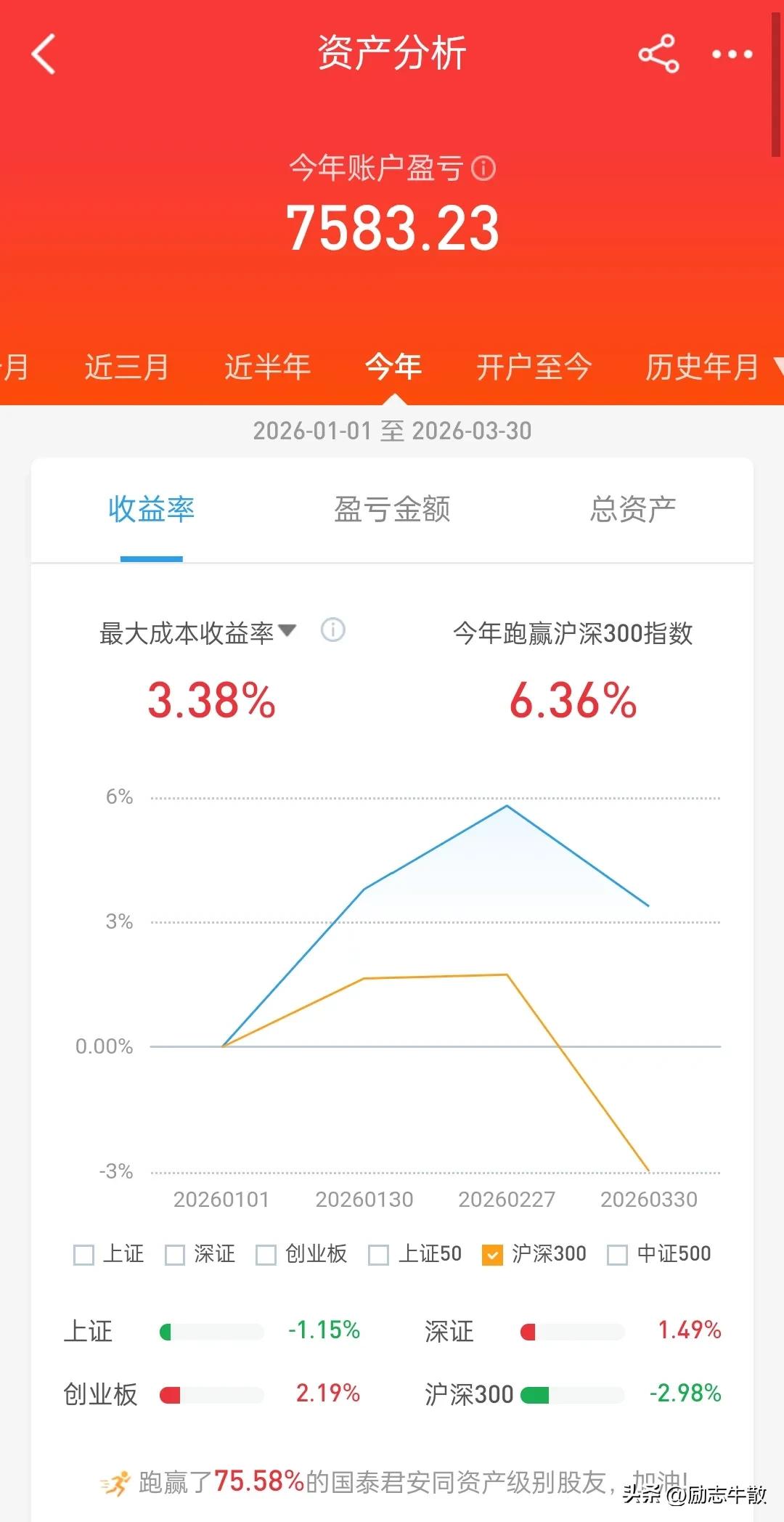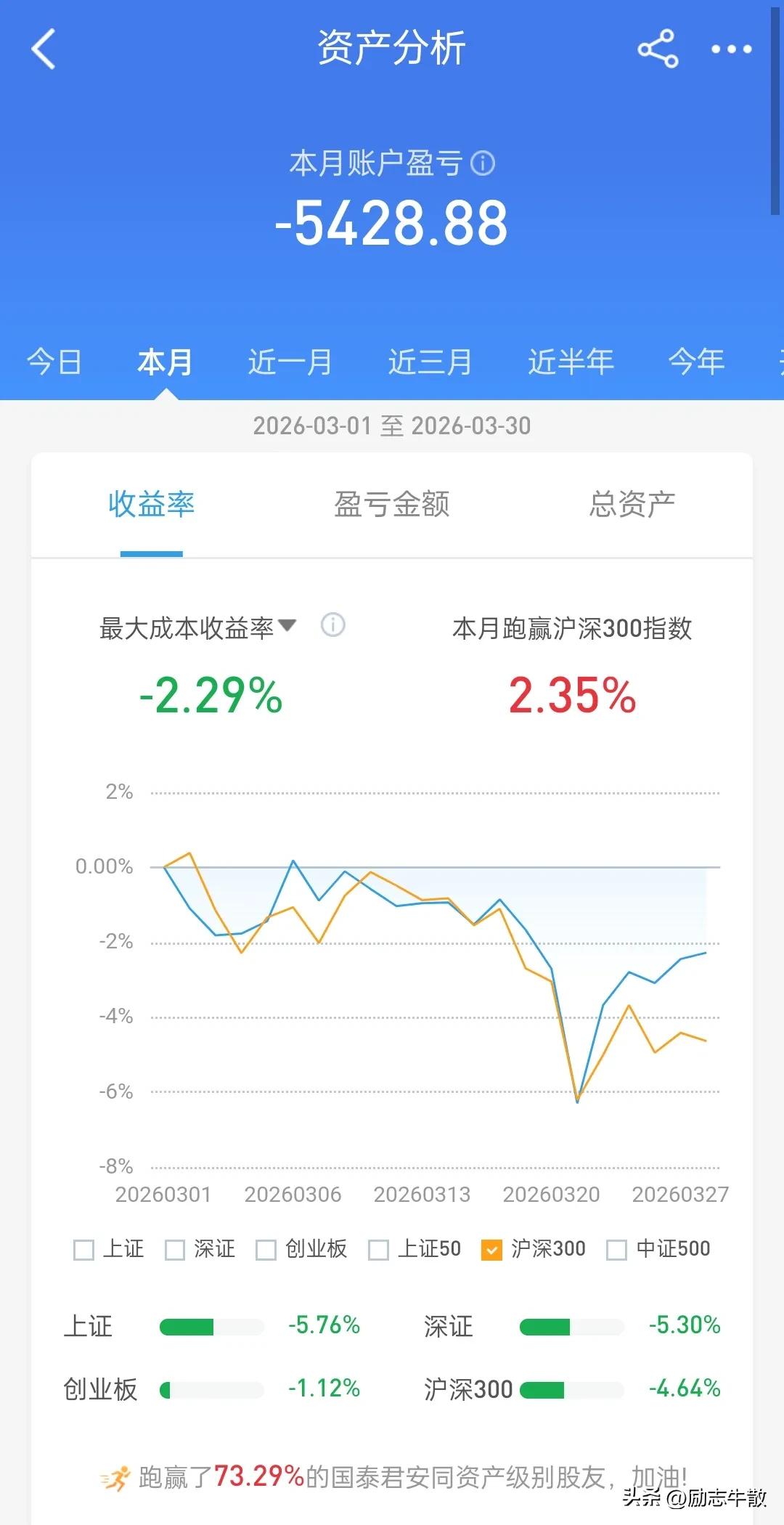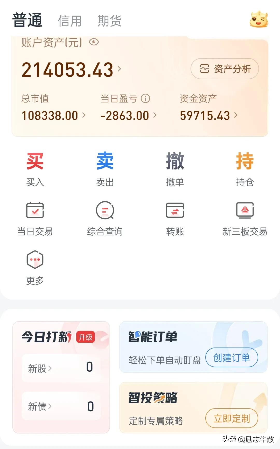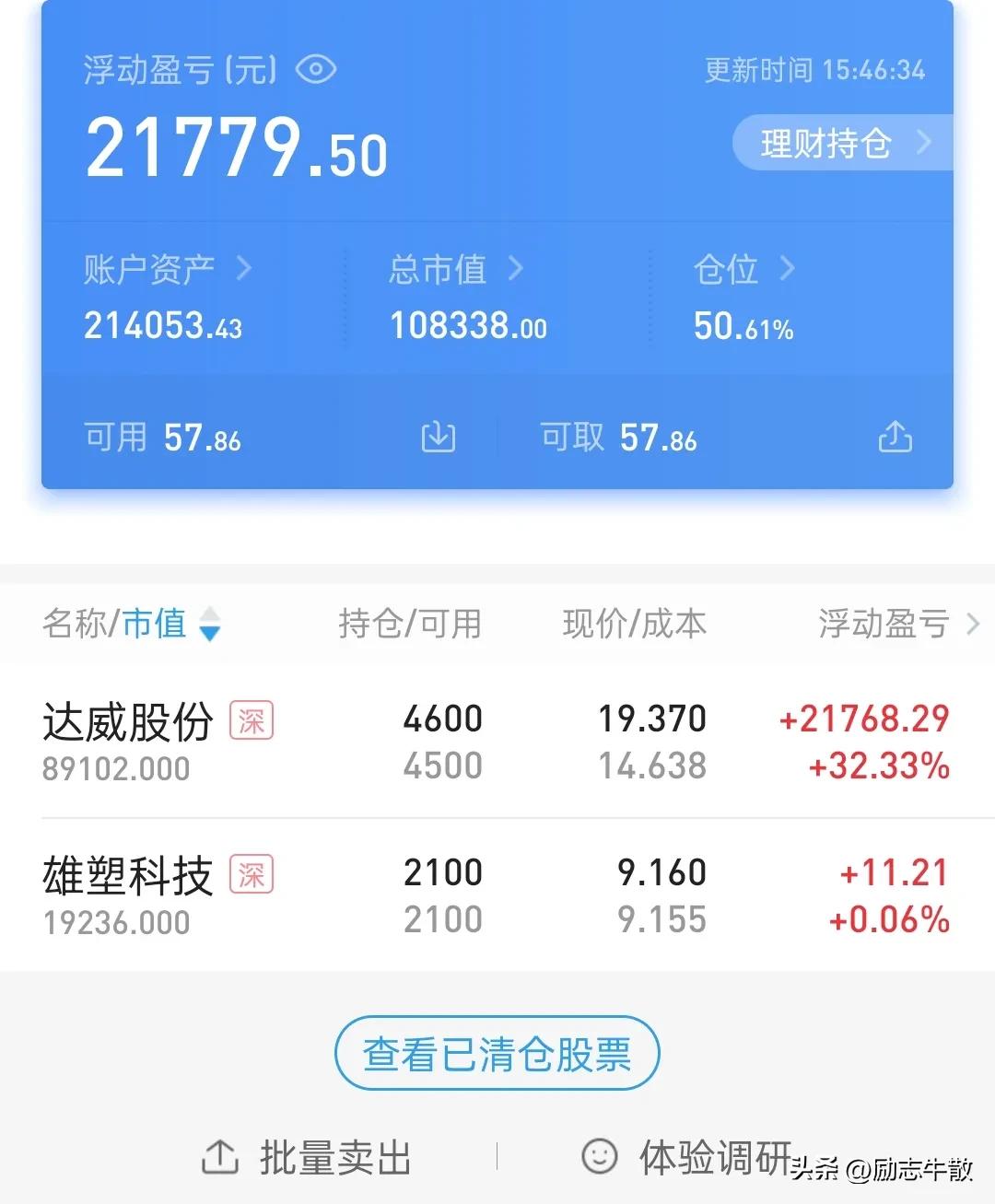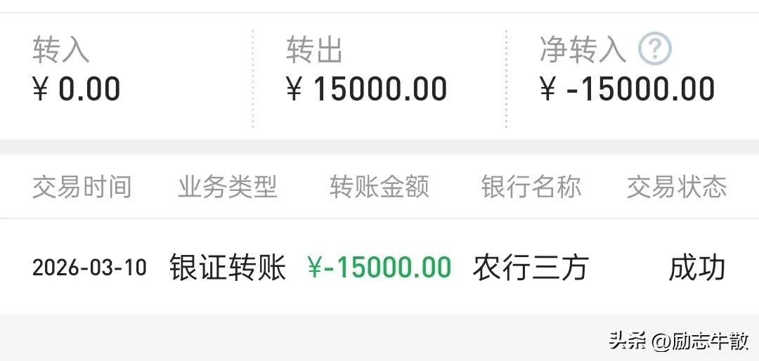 想从股市挣钱,只有一个秘诀,就是得一直往外取,而不能持续往里注,尤其牛市……牛市是给扛过漫长熊途的奖励,并非短线情绪的博弈,别不信,玩不过的,在熊市拿着廉价筹码上来的都无比艰难,想在牛市用高价筹码换取更高,那得多理想的环境中才能实现的梦想?那是看得见摸不着的一厢情愿。当下还在牛市中,一切都好说,未来某天尘归尘,土归土……一定会感谢取钱的自己…… 我这个小号里还有二十一万多,实际上只有取出去的一万五是我的,剩下的都是大家的,只是由我暂时保管,随时可能被任何人拿去,所以一定要学会藏私房钱,未来也一定会有用到的那一天! PS 尾盘加仓没成交,这种情况基本预示明天要涨,艰难的3月终于过去,4月份依然充满希望,风雨之后阳光更加灿烂!