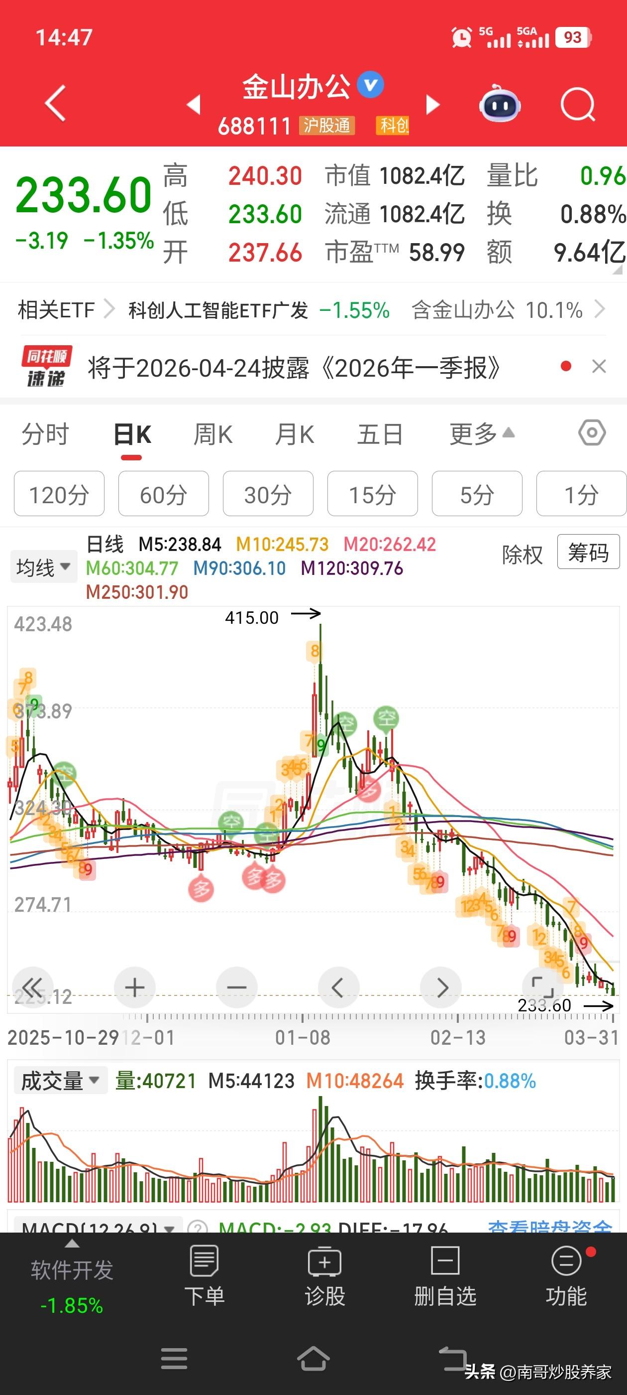 金山办公,是我的持仓股。目前为止走势是…… 创新低、不断地创新低、每天不断地创新低。这是有毒吗?天天逮着一只票,这么跌? 业绩有问题吗?是涨幅惊人?是暴雷了吗?科创50也没有跌多少。你已经腰斩了。割韭菜就不能换个地方吗?根都快刨没了大爷的……