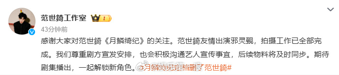 范世錡工作室回应被删 有网友发现《月鳞绮纪》定档删了范世錡,对此工作室回应:“范世錡友情出演邪灵觋,拍摄工作已全部完成。我们尊重剧方宣发安排,也会积极沟通艺人宣传事宜,后续物料将及时同步。”