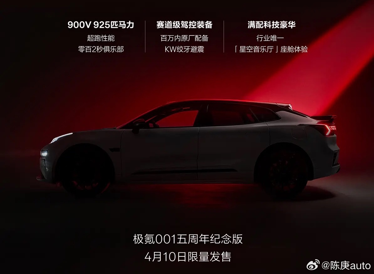 极氪001五周年纪念版要来了,原厂KW避震+925马力(680kW双电机)+外观运动套件...应该算是001小FR了,挺硬核🙈