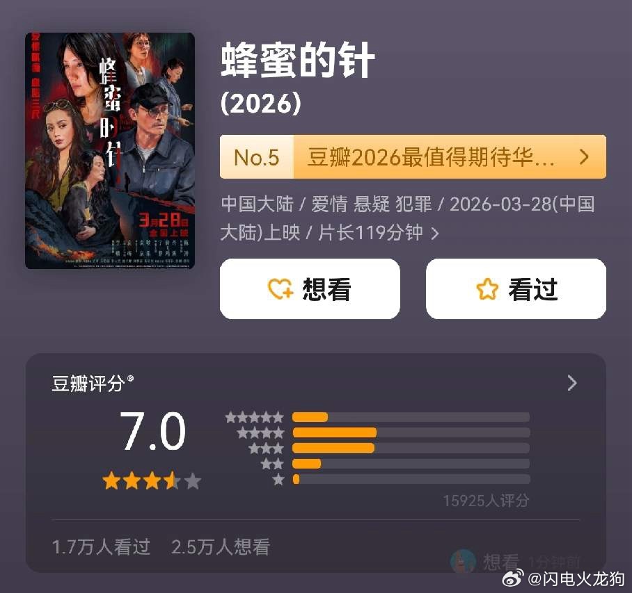 好电影不过时《蜂蜜的针》豆瓣评分7.0接近1.6万人评分,票房累计790万,预测票房1600万。电影最大的缺点就是上映的太晚了,早几年会更火 。主演袁泉演技炸裂,如果用这部电影去参加电影节,应该可以拿奖。