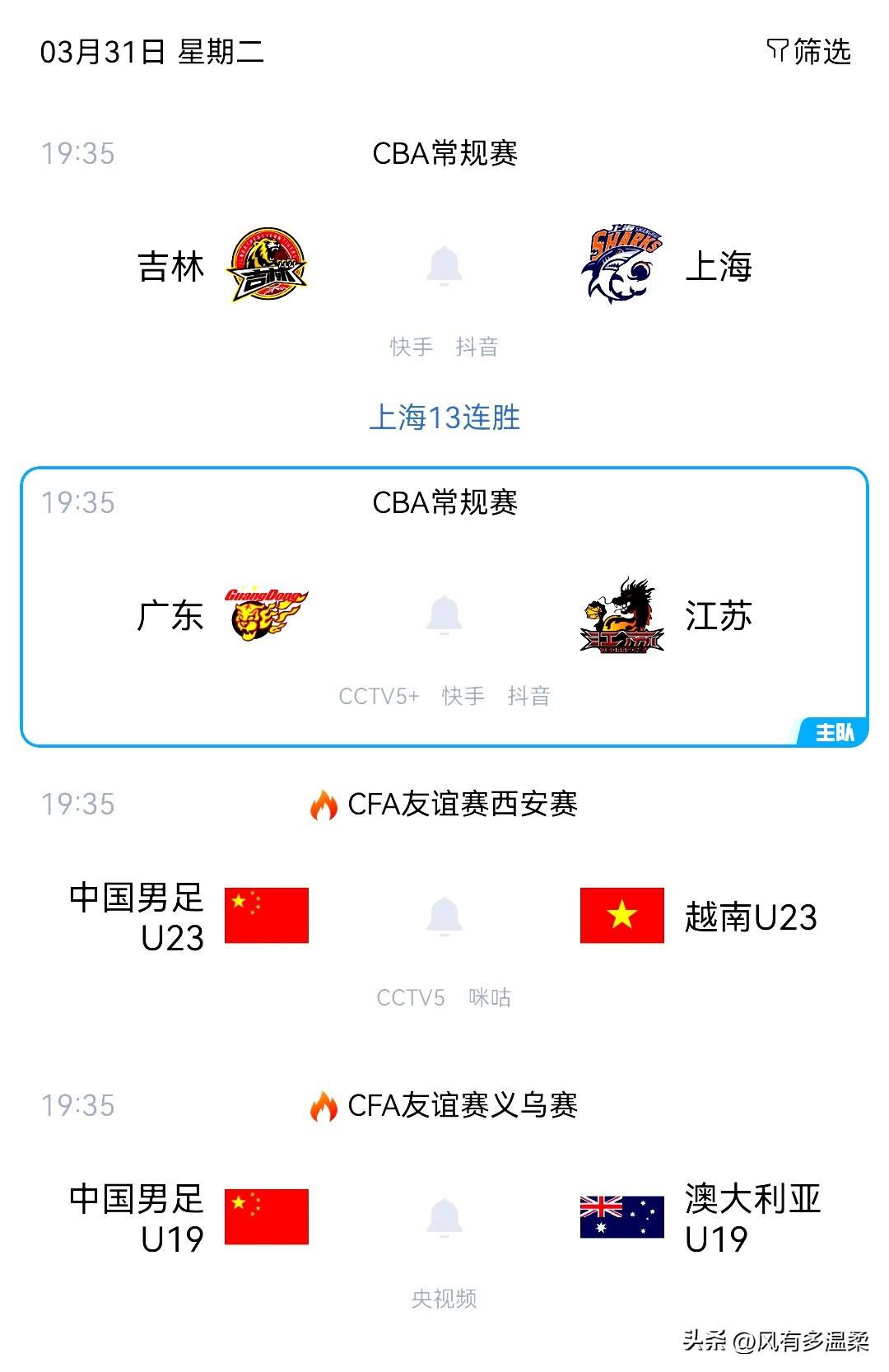 今天白天去忙琐事了,没有尽早给友友们发布今日赛事,在此先给友友们表示谦意,下面我把今晚的篮球和国足的赛事详细告知。 CBA篮球联赛,今天只有两场比赛。吉林VS上海,广东VS江苏。 吉林与上海之战,两队实力差距明显,但吉林队历来遇强不弱,曾多次将强队拉下马。面对13连胜的上海久事队,他们肯定不会举手投降。两队在球场上会有精彩之处呈现,是值得欣赏的比赛。广东客场曾被江苏1分绝杀,今天晚上广东回到主场,必须要挽回颜面。庞峥霖与徐杰的对决,将是比赛的亮点。 足球方面,中国足球u23和u19双双出战。下午国家队与喀麦隆的比赛,国足0:2失利,邵家军一胜一负。u23国足西安四国赛两连平,未偿胜迹。晚上19:35面对最后一个对手越南队,国足若胜两球以上,极有可能夺得四国赛的冠军。主教练安东尼奥带领下的u23国足,能实现这个愿望吗?U19队在与澳大利亚u19的第一回合中1:0取胜,今天晚上的第二回合能否延续胜果?我们拭目以待!