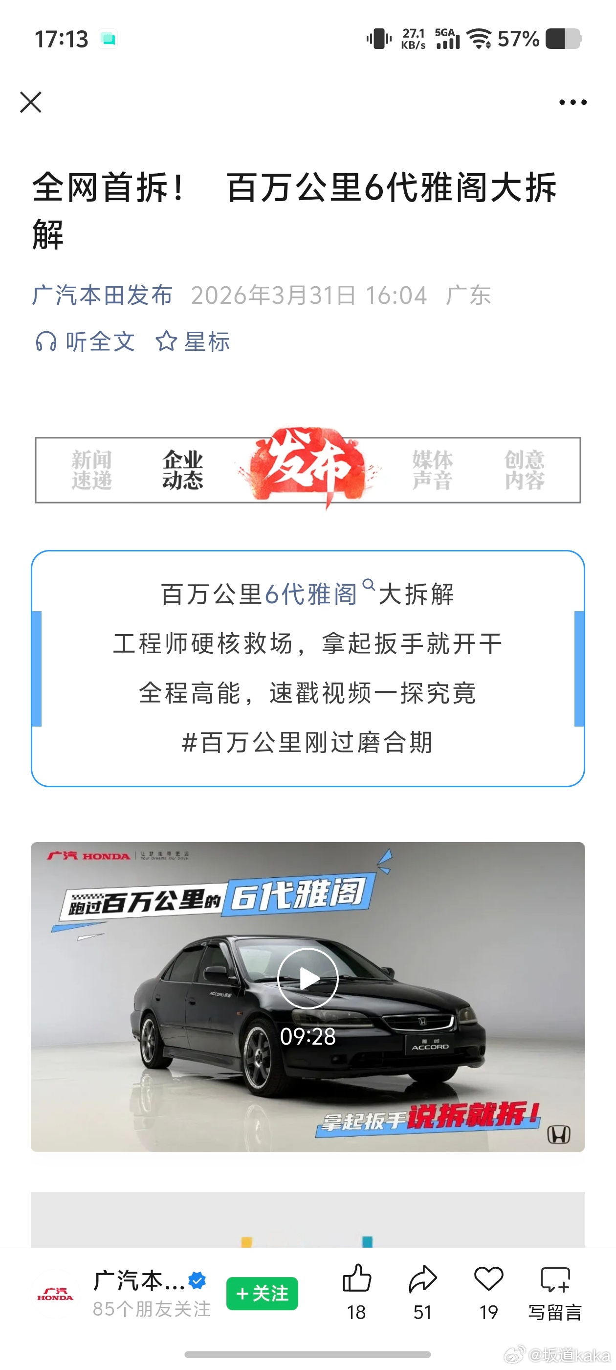 第六代老雅阁跑了100万公里,也进行拆解和传播,上了公众号。
