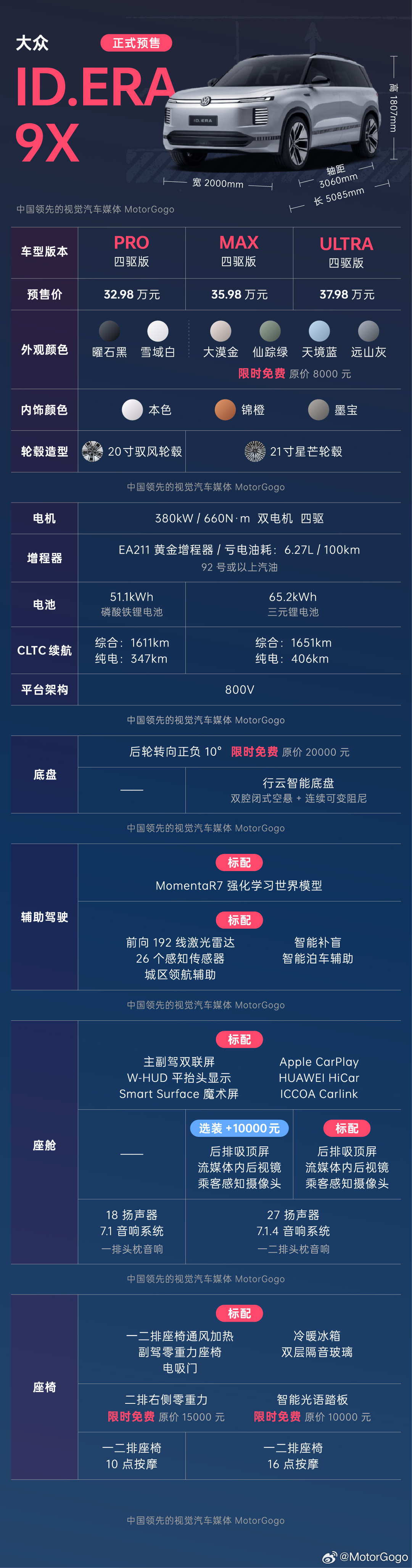 大众ID.ERA9X正式开启预售了,一张表格,带大家简单看懂它各个版本的配