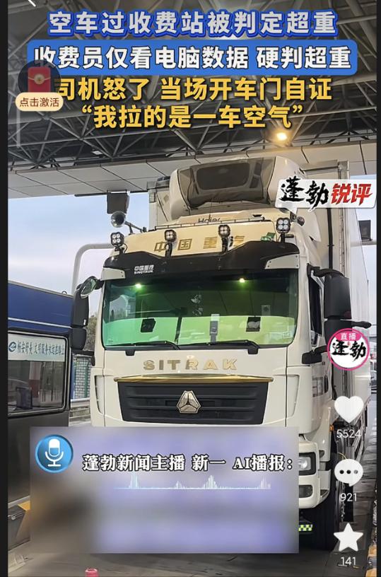 这么明目张胆!上海货车司机过收费站因超重被拦停,收费员态度强硬,不让解释判超载,谁料,司机打开车门,还真什么也没有,一车空气还能超重? 事情发生在3月26号,T上海的货车司机邱先生在经过收费站的时候被拦截了下来,收费员说电脑显示他的车超重了,于是要求他倒车。 邱先生立马说,我这个车是空车,里面什么也没拉,结果收费员态度非常强硬,并不听他的解释 看到收费员的这个态度,让邱先生非常的生气,于是他立马就把自己的车厢打开,让收费员睁大自己的眼睛,好好看一看到底有没有东西,事实上确实空无一物。 于是收费员拍照后才改变了态度,随即邱先生找到了收费站的负责人,要求收费员向他道歉。 这件事情看似简单的处理完了,实际上也是细思极恐。 明明货车上没有装一个物件,结果却显示超载,这说明收费站的设备有问题,但凡邱先生车上装了一点货,那就真的说不清了。 有的网友感慨这是发现了没发现的,这得挣多少呀? 还有的网友吐槽,收费站以诈骗为主,诈的一个是一个。这回也算是又出一成语——空车超载。 正确的做法是视频拍下记录,接着问它称准不准,接着问几次让它确认称准不准,接着叫它开发票,拿到发票付款,原地报警,留下报警回执,然后就可以去法院告它了