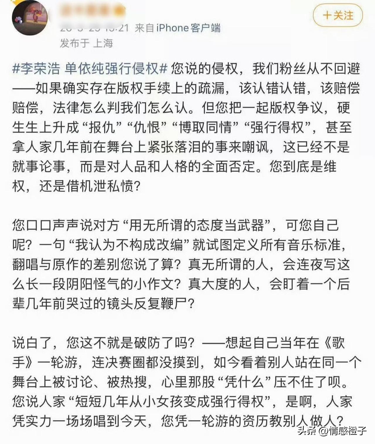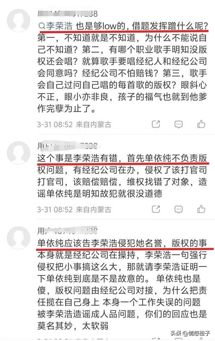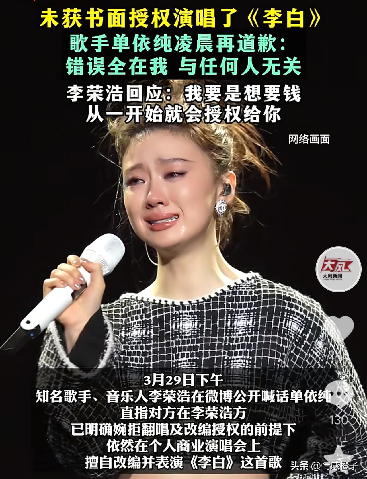 单依纯未经授权演翻唱《李白》 李荣浩发文怒斥侵权,别把版权当儿戏 这两天单依纯翻唱李白,被李荣浩发文斥责[笑哭]。本来"如何呢?又能怎"这个网络梗,因单依纯翻唱李白火出圈。 也给她带来不少热度,不过自她翻唱这首歌后,一直被人诟病[思考]。此次单依纯未经授权,在演唱会翻唱了李白,被歌手李荣浩发文怒斥[机智]。 按李荣浩的说法,单依纯团队曾联系过他,但他未同意授权。然而这首歌依然在演唱会被翻唱[灵光一闪]。 这事很清楚,单依纯歌翻这首歌火出圈,那是她的本事。但未经授权就去商演,这就侵权行为啊[6]。 事情发酵后,单依纯向李荣浩道歉。但部分单依纯粉丝和网友,不仅没正视版权问题,反而混淆视听,网上对李荣浩进行"攻击"[黑线]。 版权是创作者的心血,也受法律保护。如果因为"粉丝多"就无视版权,那创作者的权益如何保障[灵光一闪]? 追星可以,但基本是非观不能没有吧[思考]?关于这件事你是咋看的?欢迎来评论区说说。