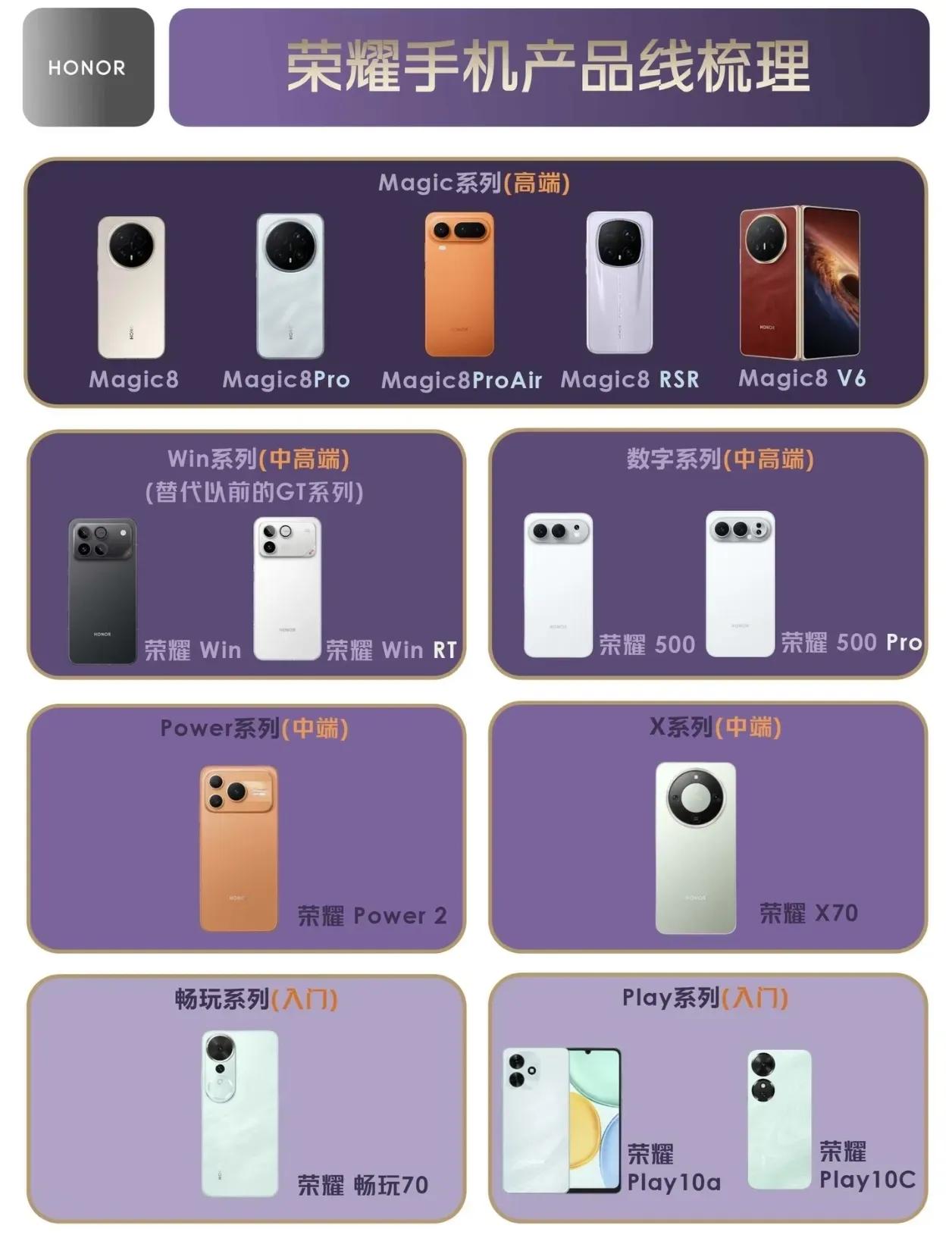 荣耀这次是真把产品线理得明明白白的,刀法那叫一个“快准狠”。 Magic系列负责高端前沿,Win系列直接碾压友商全家桶,连Power和X系列都学会卡位了。以往荣耀被吐槽系列多、杂、定位模糊之类,现在Magic8系列、Win、数字系列三条线并行,高端有折叠屏V6撑场,中端靠荣耀500 Pro走量,Power2和X70则负责稳住线下基本盘。 说白了,荣耀不再靠单款爆品打天下,而是用矩阵式围剿,说真的只要体验不翻车,友商腾出的位置,它还真能稳稳拿捏!