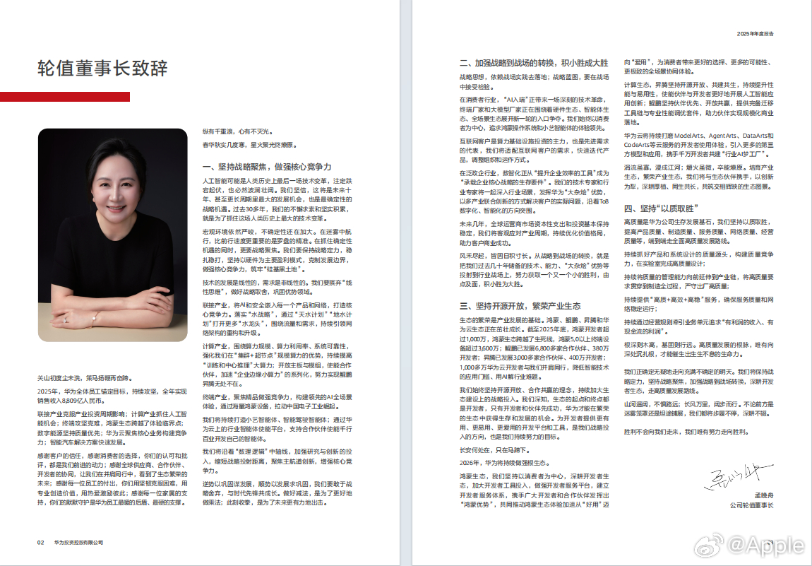孟晚舟华为年报致辞谈战略聚焦 刚听完孟晚舟女士的华为2025年报致辞,真的特别有感触。在这么难的大环境下,华为还能交出一份稳扎稳打的成绩单,太不容易了。最打动我的,就是华为不折腾、不跟风,一门心思聚焦主业的清醒。外面风口换了一个又一个,它始终沉下心做技术、搞研发,把核心能力攥在自己手里。不贪多、不求快,认准一条路就死磕到底,这种专注和定力,现在很少有企业能做到。