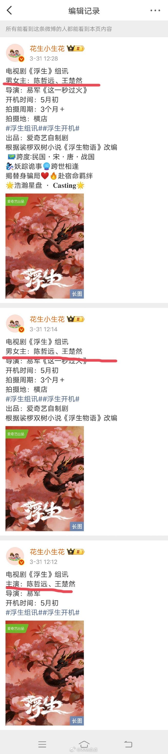 网友说《浮生物语》王楚然陈哲远平番,因为真瓜主发组讯时特地编辑了,把主演改成男女主,平番剧他都会写男女主。如果按姓氏笔画,王楚然在前。。。
