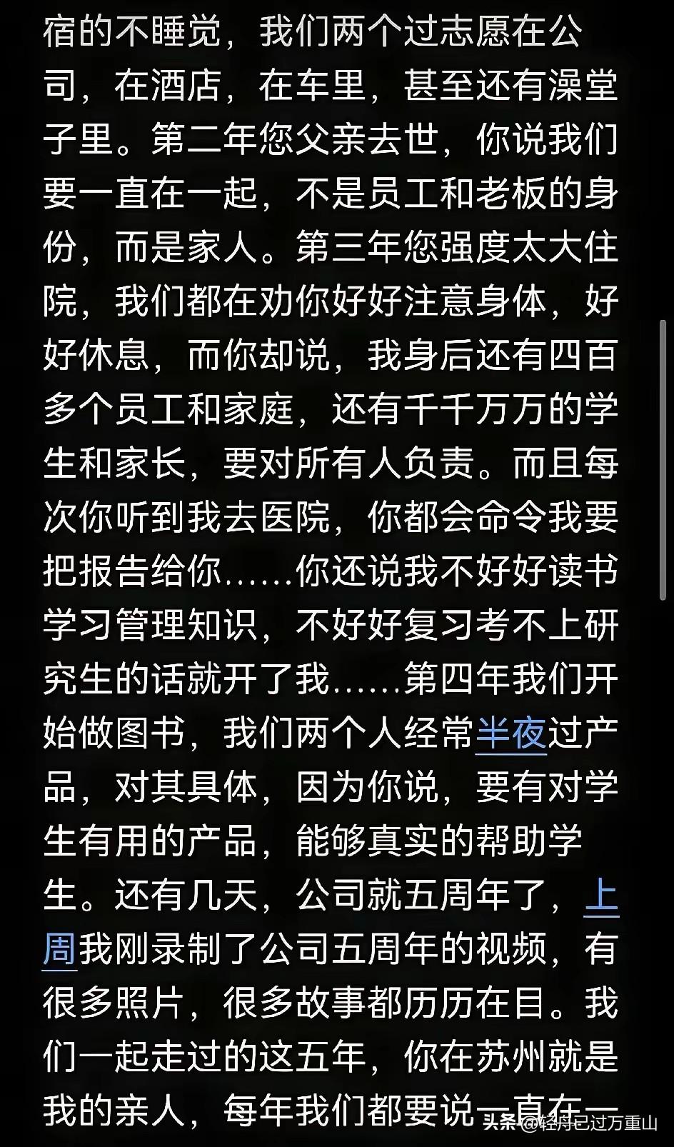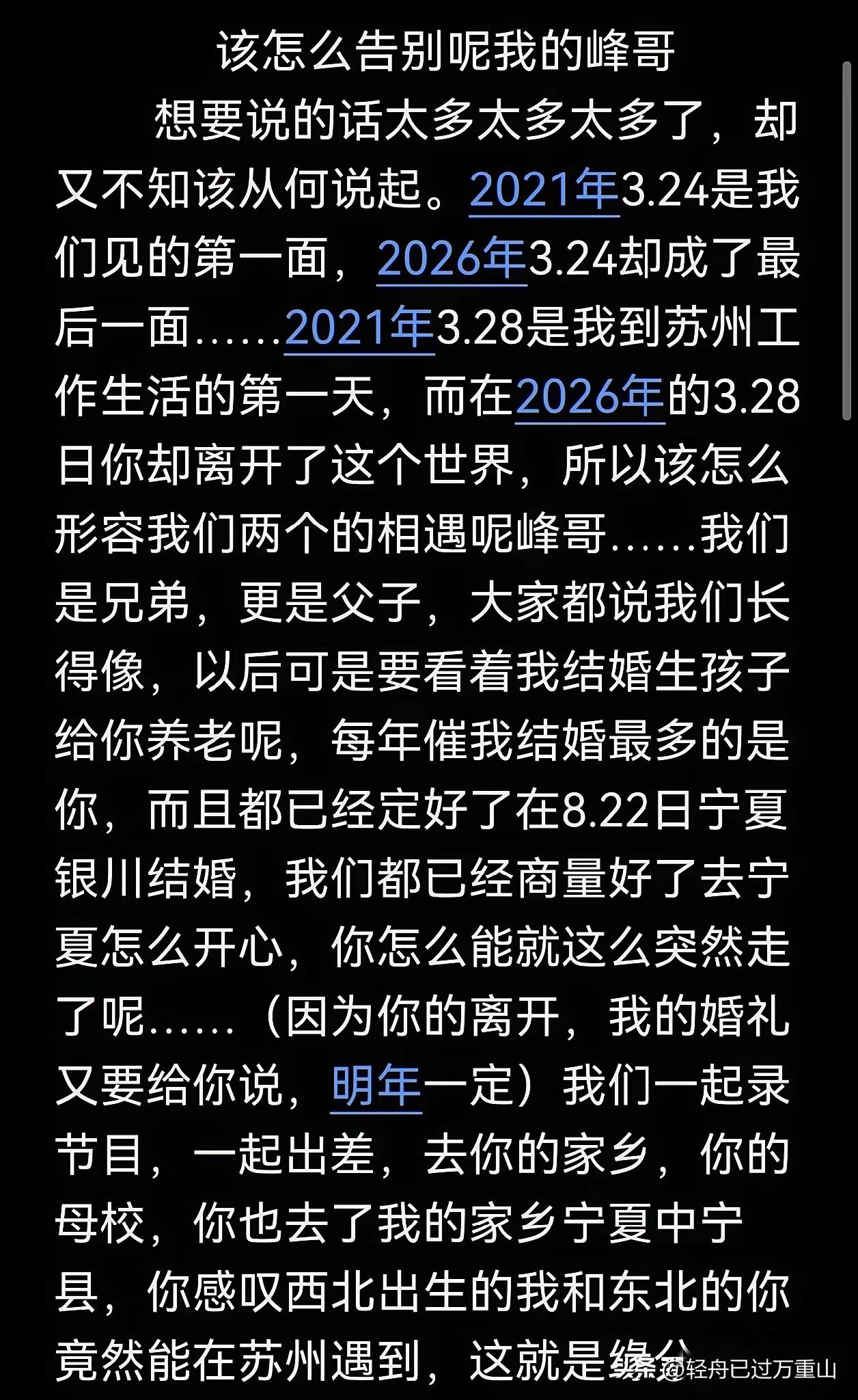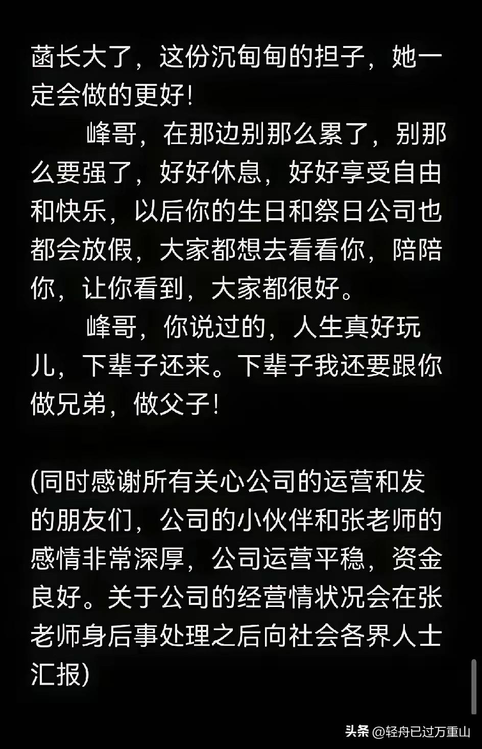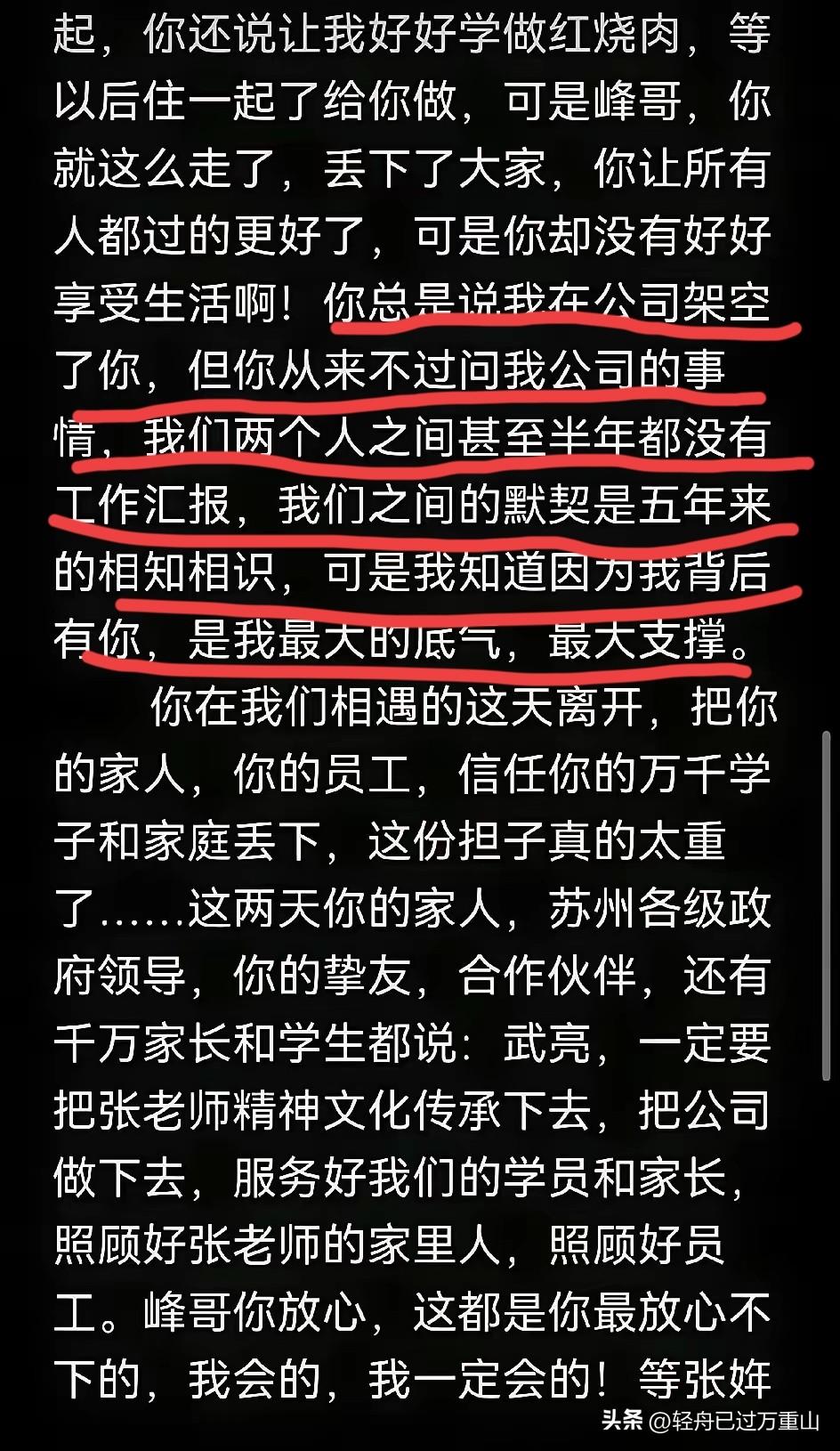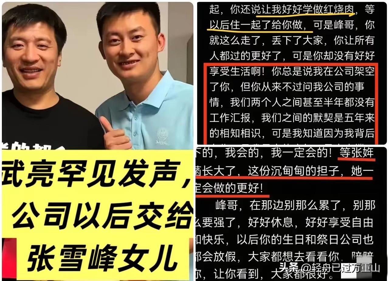 在张雪峰离开的头七,张雪峰的接棒人武亮发了一篇祭文,他说:你总是说我在公司架空你,但是你从来不过问公司的事情,我们两个人之间甚至半年都没有工作汇报,我们之间的默契是五年来的相知相识,可我知道我是因为背后有你,你是我最大的底气,最大支撑。 看完他的千字长文,我才发现武亮有多感激张雪峰,他说他们的关系像兄弟,更像父子,两人一起熬夜做高中复习资料,他把员工当成亲人,催他结婚,催他考研,甚至给他画大饼 ,说让他拼命干,三年拿下苏州的房子。 一路走来,武亮能力很强,也很能吃苦,但是他从来没有想过超过老板,他对老板的感情甚至比父子都要亲,他跟着张雪峰去过东北,去过他曾经上过的小学初中高中,张雪峰也跟着武亮去过宁夏,两人都感叹缘分太深,一个来黑龙江富裕县,一个来自宁夏中宁县,两人在苏州相遇,一起打拼属于他们的商业帝国 两人相遇的时间是2021年3月24日,那是他们的第一面,想不到最后一面竟然是2026年3月24日,2021年3月28日是武亮到苏州工作的第一天,想不到2026年3月28日是张雪峰的追悼日,两人的缘分刚好5年,但是感情太深了,武亮甚至想过要给张雪峰养老送终,但是遗憾的是只送终了,没能养老,张雪峰当年父亲走了很伤心,他和武亮说他们要永远在一起。 他和张雪峰的关系真的太好了,超越了员工和老板的关系,都已经把对方当成生命中最重要的人,武亮想不到张雪峰会这么快离来,原先计划今年8月22日在银川结婚的武亮,计划着和张雪峰一起开开心心在银川玩一阵子,但是因为张雪峰走了,武亮决定婚期延迟举行,这是对逝者的尊重,在他生命中已经把张雪峰当成了自己的父亲。 现在张雪峰走了,他来挑大梁,当公司的掌舵人,你以为他谋权篡位,其实他说只是替张雪峰的女儿坐着,以后等他女儿长大了,会把这根接力棒交给张姩菡,看得出武亮是一个重情重义的人,张雪峰没有看错人。 武亮在发的长文里说,张老师的账号和视频作品,都会好好保存,一直留着,等他女儿张姩菡长大,亲手交给孩子。还说等孩子长大,就让她接手公司。 最让人鼻子发酸的是,武亮说他已经把张老师平时骑的那辆电瓶车擦得干干净净,好好收起来。而且以后张雪峰的生日和忌日都会放假,说因为大家都想去看看你,让你看到大家都很好…… 武亮的千字长文戳中了我的泪点,看得出每一个文字都是有感而发,因为措辞诚恳,用情至深,太感动了,世间竟然有这样的神仙公司和神仙老板,还有这样的神仙员工……