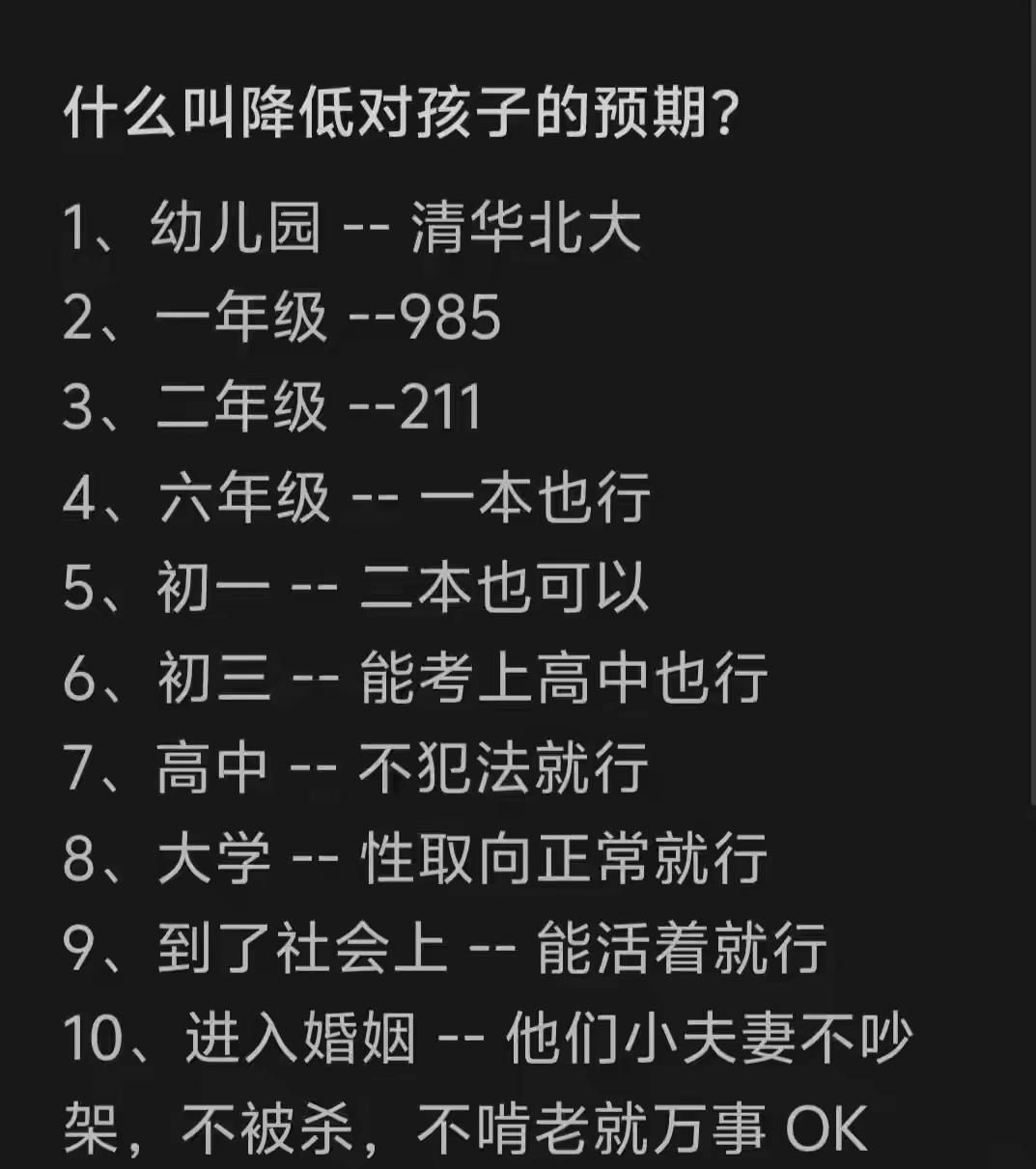 当初那个信誓旦旦要上清华的小孩,现在能半夜给我回个微信,我就谢天谢地了。 当父母,就是个不断给自己台阶下的过程。这个台阶,从清北一路铺到“活着就行”。 娃刚上幼儿园那会儿,我是真心觉得——这孩子,清华北大的料啊,天赋异禀! 一年级,985保底吧,问题不大。 二年级,211也行,咱不挑。 六年级……一本,一本能上就不错了。 初一,二本也行,大学嘛,有个学上就行。 初三,我的底线是:能考上高中,求你了。 高中以后,彻底想开了——不犯法就行。 大学?性取向正常,别的随便吧。 等到孩子真出了社会,我的愿望简朴到令人心碎:活着,健健康康活着就好。 再后来,孩子结婚了。我的标准又降了——小两口不吵架,不被对方杀了,不回来啃老,这就是模范家庭了。 现在呢?孙辈都有了。我的要求只剩一条:健康,不傻,丑点笨点都没事。 不是我放弃了,是我终于活明白了。 为人父母,最大的修行,就是把心从清华北大,一步一步,修炼成“活着就好”。 你呢,走到第几步了?每一级,都是和解。