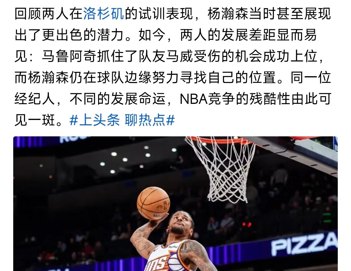 杨瀚森的一生之敌太阳马鲁阿奇, 就像姚明一生之敌太阳斯塔德迈尔。 都说马鲁阿奇是杨瀚森的好友, 在洛杉矶试训时杨瀚森表现更出色。 没想到这位10号秀已经进入太阳主力轮换, 今天砍下6分11篮板3次盖帽, 帮助太阳131比105大胜灰熊。 而杨瀚森还在发展联盟挣扎, 常规赛只能在垃圾时间露个脸, 杨瀚森跟马鲁阿奇的差距越来越大。 当初姚明虽然被小斯所压制, 但个人表现可以与小斯势均力敌。 希望小杨能打进主力轮换阵容, 争取成为球场上能与马鲁抗衡的敌人。