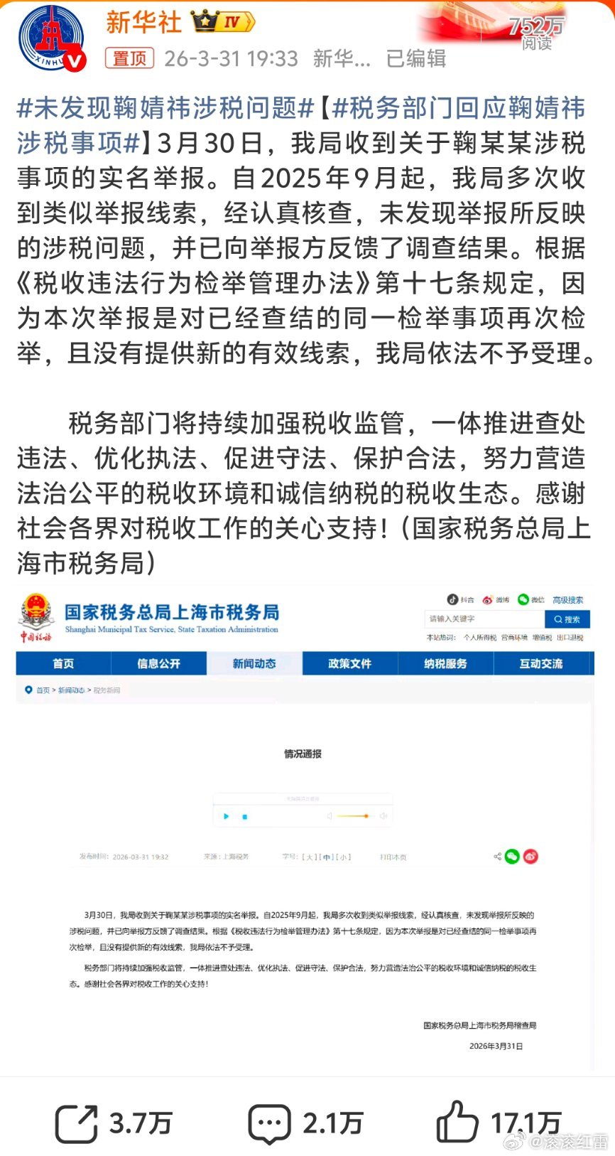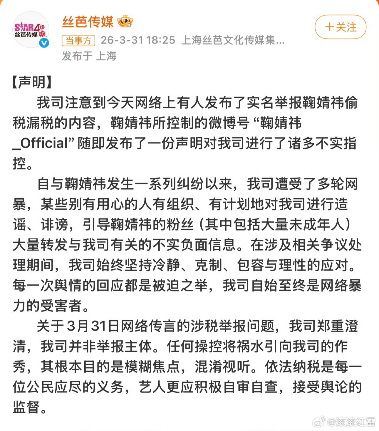 未发现鞠婧祎涉税问题丝芭三问鞠婧祎税务:没查出问题,不予受理。丝芭:我还是要问三问,我不是主体不是我。——法律结论在前,舆论追问在后。是非曲直,看官方,不看话术。