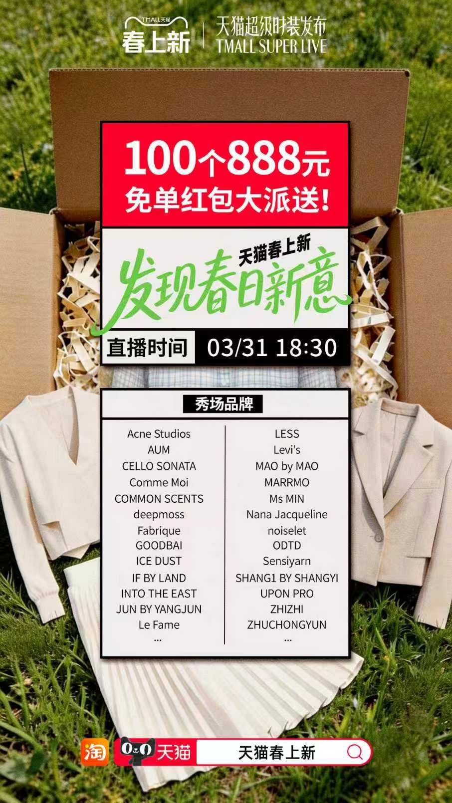 天猫春上新活动现已全面开启,2026 年春季四大核心穿搭趋势 —— 柔系职场、原野诗意、复古摩登、高智动感,完美契合当下春日审美潮流。已经替你们挖到了宝藏明星同款店铺,从通勤优雅到街头少年感,一站式搞定所有风格✨ 3月31日18:30,锁定天猫官方直播间✨ 跟着超模何穗、关茈文及时尚达人一起解锁春日四大风格,发现穿搭新意,还有100个888元大额红包等你抽! 这个春天,来天猫看秀,把时髦穿在身上~ 想要get更多同款趋势单品,直接上🍑搜「天猫春上新」就能一键解锁啦!。