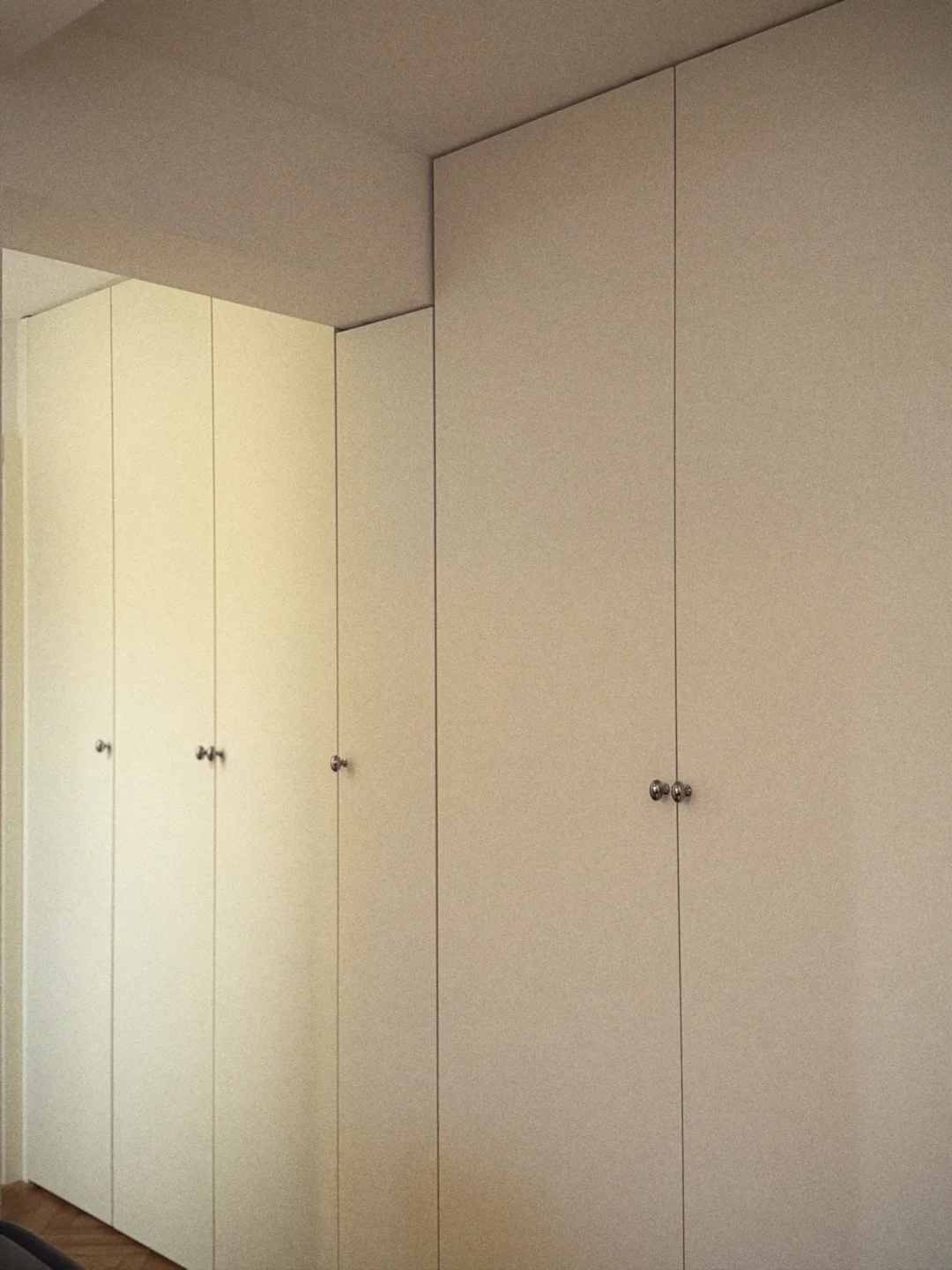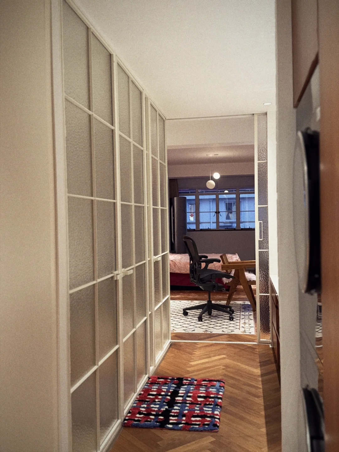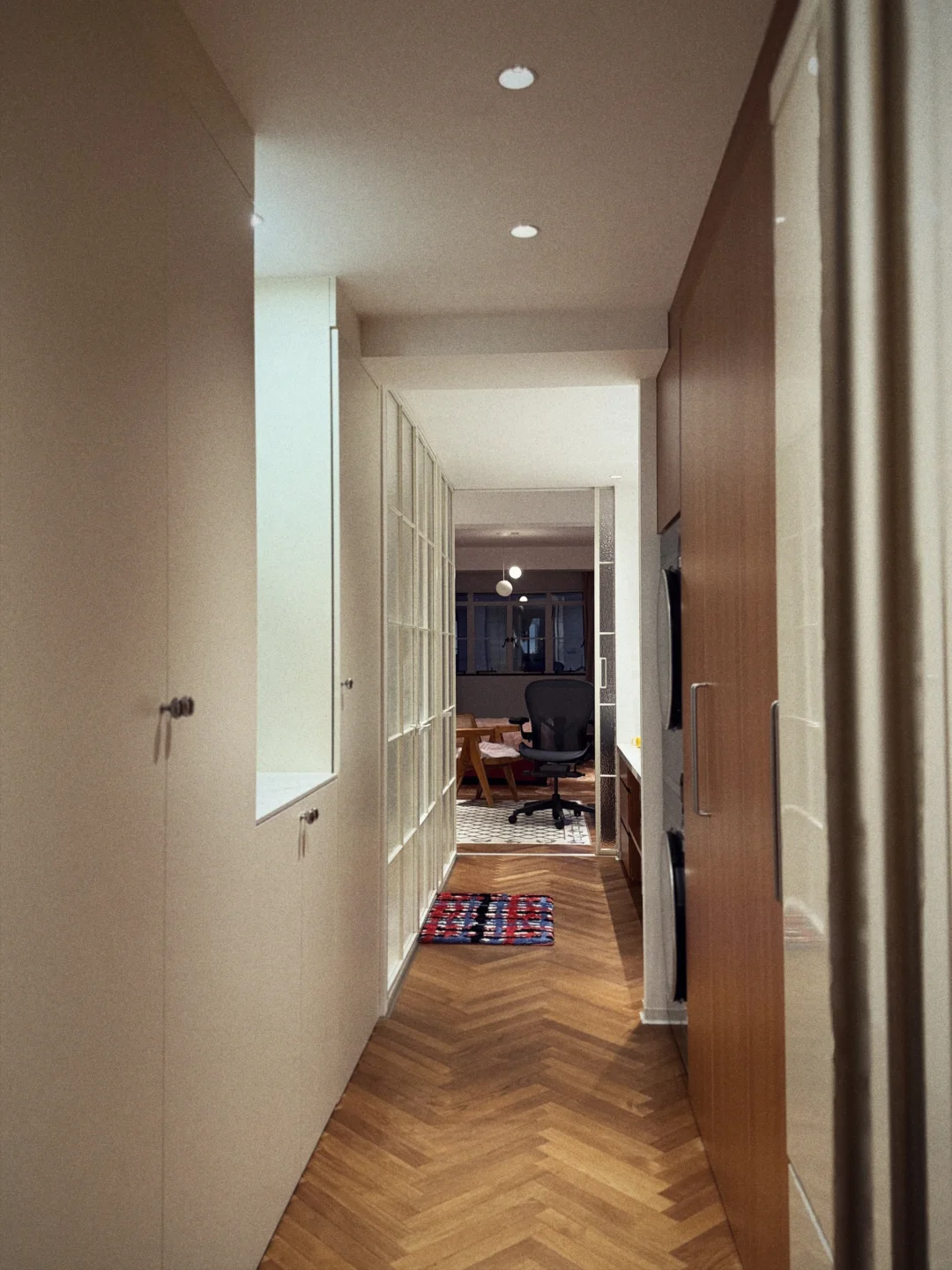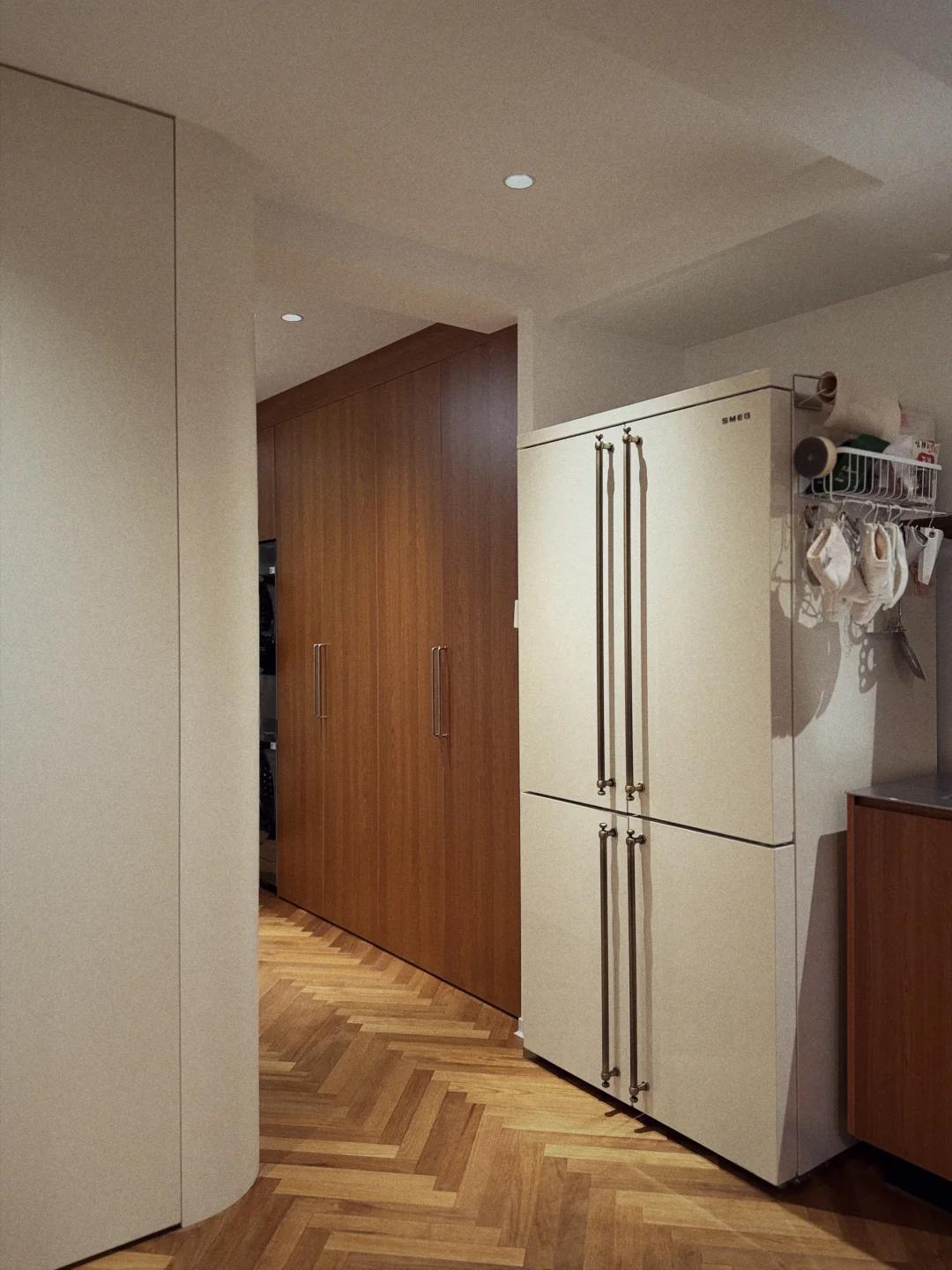 首先是颜色,全部按照SMEG冰箱的奶呼呼的白定制,几乎没有色差,加上全屋通铺的柚木地板,简直就是巴黎的感觉了! 然后是各式各样的玻璃门,都做到了和效果图一比一的落地效果!还通过毫米级别的规划,没有浪费任何一厘米的储物空间~ 很满意~
