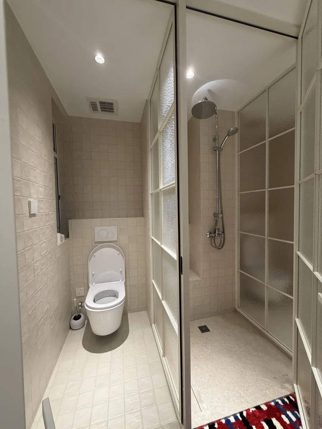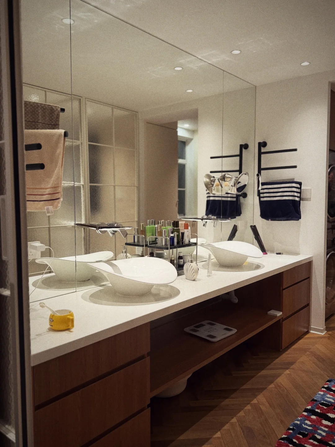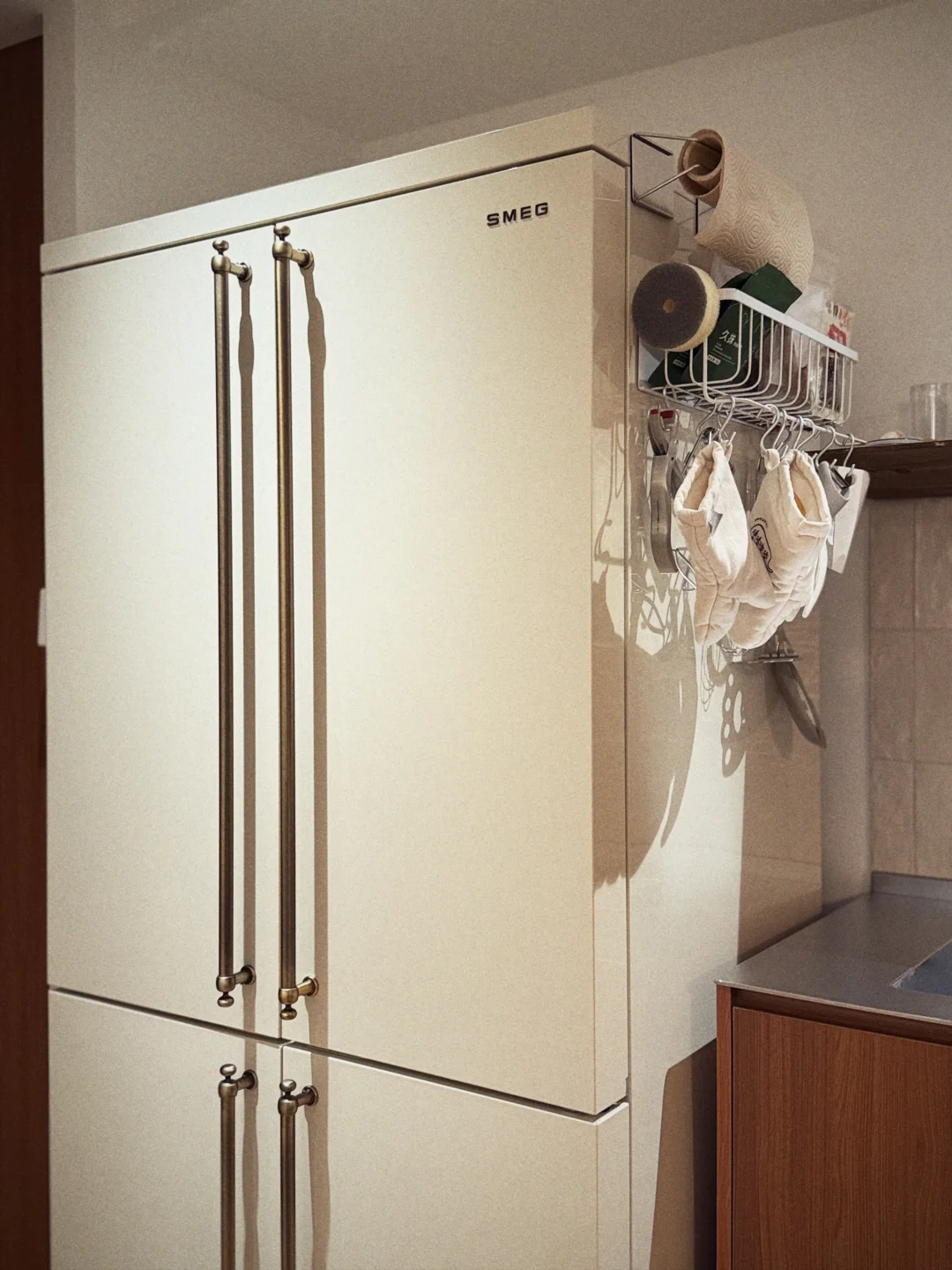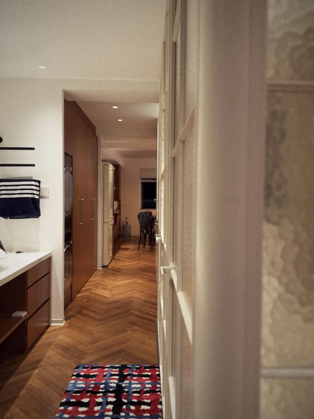 首先是颜色,全部按照SMEG冰箱的奶呼呼的白定制,几乎没有色差,加上全屋通铺的柚木地板,简直就是巴黎的感觉了! 然后是各式各样的玻璃门,都做到了和效果图一比一的落地效果!还通过毫米级别的规划,没有浪费任何一厘米的储物空间~ 很满意~