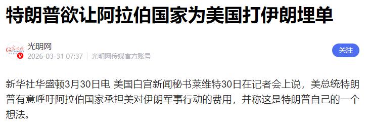 海湾国家全部看走眼了!没想到美国会来这么一手! 当地时间3月30日,白宫新闻秘书莱维特在记者会上,被问到阿拉伯国家是否会协助支付当前对伊战争的费用时,态度暧昧却又直言不讳——她不会抢在特朗普之前透露具体消息,但这话里话外都在确认,让阿拉伯国家为战争买单,确实是特朗普一直以来的想法。 这一下,估计所有海湾国家都懵了,本以为是并肩作战的盟友,转头就被当成了“提款机”,这种翻脸不认人的操作,实在令人咋舌。 说起来,海湾国家这些年对美国可谓是掏心掏肺,尤其是沙特、阿联酋这些国家,不仅常年购买美国的武器装备,还在能源、经贸等领域对美国百般配合,只为换取美国的安全庇护,抵御伊朗带来的安全压力。 而就在不久前,阿联酋、沙特还在积极游说美国,希望美国能继续加大对伊朗的军事打击力度,可他们万万没想到,自己的一片赤诚,换来的却是美国的算计。 美国一边拿着海湾国家的好处,一边打着战争的算盘,如今战争打响、开销剧增,就立刻想到了让海湾国家来兜底,这种唯利是图的做法,简直刷新了这些国家的预知底线。 其实美国的这一想法,并不是一时兴起,甚至可以说是故技重施。 早在1990年代的海湾战争中,美国就曾让科威特、沙特等海湾国家承担了战争总成本80%以上的费用,当时海湾战争总共花费约611亿美元,美国自己只掏了73亿美元,剩下的几乎全由盟友买单。 如今时隔几十年,特朗普又想复制这一操作,足见美国从来没有把海湾国家当成真正的盟友,只是把他们当成了可以随意拿捏、随时薅羊毛的“冤大头”。 更让人感到讽刺的是,美国一边向海湾国家施压,要求他们掏钱买单,一边还给出了两个令人难以接受的选项:要么拿出5万亿美元,让美国继续推进对伊战事;要么拿出2.5万亿美元,用来支付美国近期的战争开支,换取战争结束。 这哪里是求助,分明是赤裸裸的勒索。海湾国家即便财力雄厚,也经不起这样的狮子大开口,而且这场战争本就是美国主动发起的,与海湾国家的核心利益虽有关联,但也绝没有到需要他们倾囊相助、承担全部费用的地步。 现在的海湾国家,可谓是进退两难、骑虎难下。一方面,他们短期内还离不开美国的安全庇护,毕竟伊朗的军事实力不容小觑,尤其是伊朗手中的导弹和无人机,以及其支持的胡塞武装,都对海湾国家构成了不小的威胁,所以他们不敢轻易得罪美国。 可另一方面,美国的要求实在太过苛刻,一旦答应,无疑会让自己的经济陷入困境,而且也会彻底看清美国的真面目,今后再想与美国相处,只会更加被动。 更有意思的是,海湾国家内部也出现了分歧,阿联酋、沙特还在坚持游说美国继续打击伊朗,而阿曼、卡塔尔则倾向于通过外交途径解决冲突,这种内部的不统一,只会让美国更加有机可乘。 说到底,海湾国家还是太天真,误以为靠金钱和妥协就能换来美国的真心庇护,殊不知在特朗普的眼中,所有的盟友关系,都只是利益交换。 美国当前面临着严峻的财政压力,国债总额早已突破高位,发动对伊战争更是让其开销剧增,在这种情况下,财力雄厚的海湾国家自然就成了他们的首要目标。 特朗普的“交易型外交”从来都不掩饰,对他而言,没有永远的盟友,只有永远的利益,只要能让美国受益,哪怕牺牲盟友的利益也在所不惜。