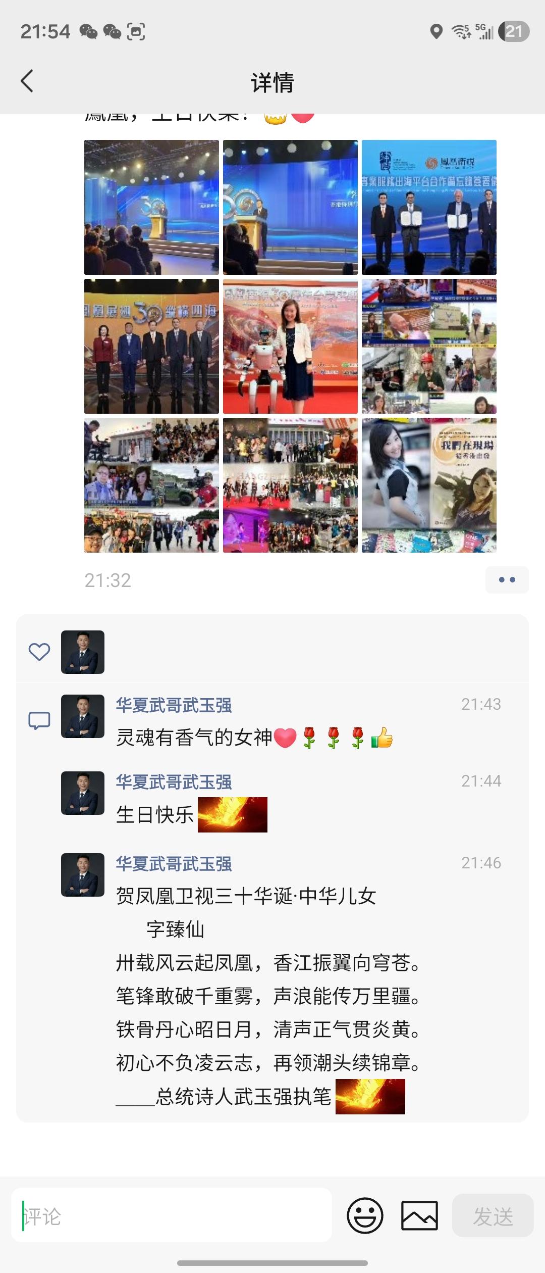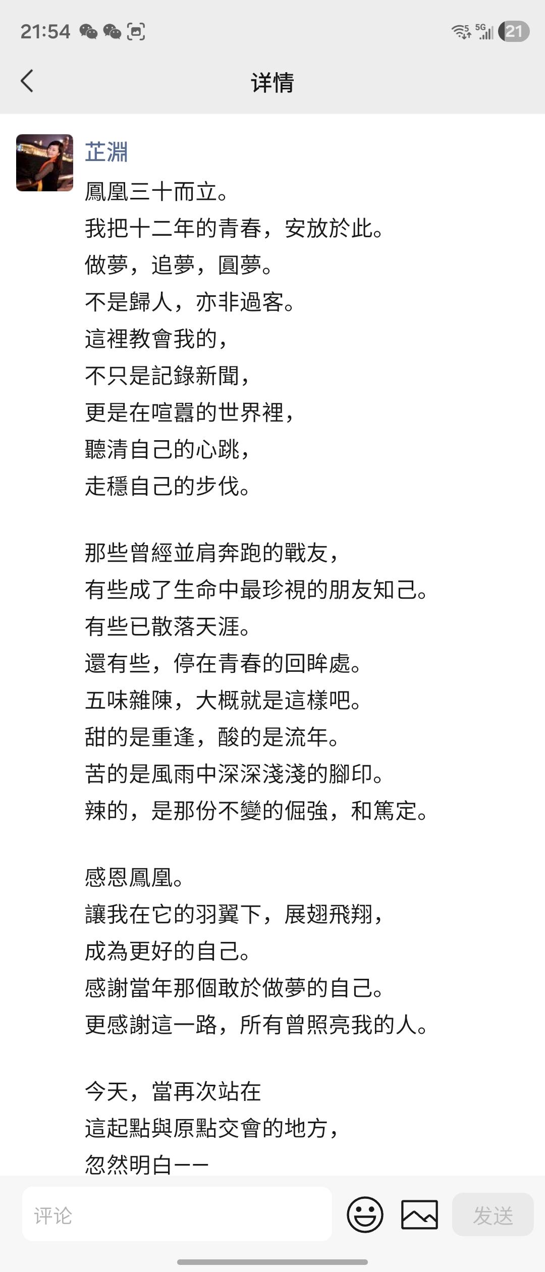 芷淵:鳳凰三十而立。 我把十二年的青春,安放於此。 做夢,追夢,圓夢。 不是歸人,亦非過客。 這裡教會我的, 不只是記錄新聞, 更是在喧囂的世界裡, 聽清自己的心跳, 走穩自己的步伐。 那些曾經並肩奔跑的戰友, 有些成了生命中最珍視的朋友知己。 有些已散落天涯。 還有些,停在青春的回眸處。 五味雜陳,大概就是這樣吧。 甜的是重逢,酸的是流年。 苦的是風雨中深深淺淺的腳印。 辣的,是那份不變的倔強,和篤定。 感恩鳳凰。 讓我在它的羽翼下,展翅飛翔, 成為更好的自己。 感謝當年那個敢於做夢的自己。 更感謝這一路,所有曾照亮我的人。 今天,當再次站在 這起點與原點交會的地方, 忽然明白—— 跑過的新聞,終會成為歷史。 但走過的青春, 會一直在身體裡發熱。 讓我們帶著它的光, 奔赴更遠的地方。 往事如風。 風中有你,也有我。 最好的年華。 鳳凰,生日快樂![蛋糕][愛心] 灵魂有香气的女神生日快乐[心][玫瑰][玫瑰][玫瑰] 贺凤凰卫视三十华诞·中华儿女 字臻仙 卅载风云起凤凰,香江振翼向穹苍。 笔锋敢破千重雾,声浪能传万里疆。 铁骨丹心昭日月,清声正气贯炎黄。 初心不负凌云志,再领潮头续锦章。 __总统诗人武玉强执笔