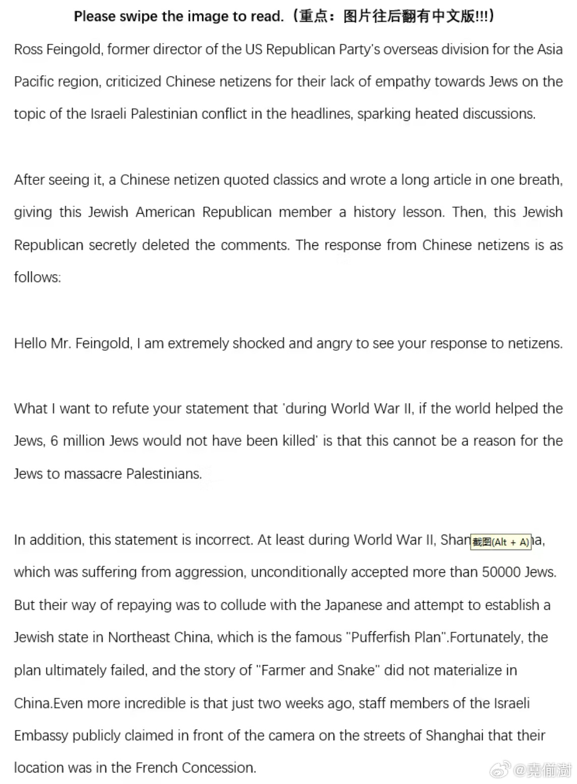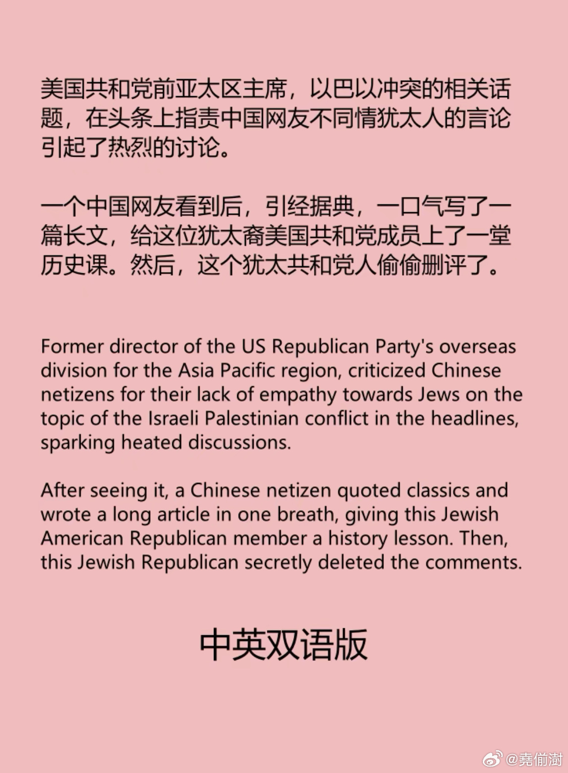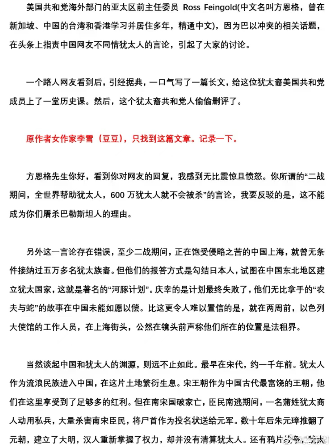 美国共和党前亚太区主席,以巴以冲突的相关话题,在头条上指责中国网友不同情犹太人的言论引起了热烈的讨论。一个中国网友看到后,引经据典,一口气写了一篇长文,给这位犹太裔美国共和党成员上了一堂历史课。然后,这个犹太共和党人偷偷删评了。巴以冲突美以伊最新局势