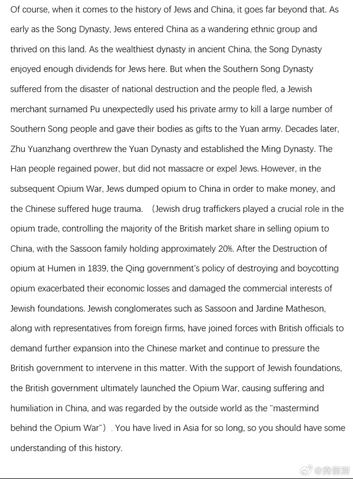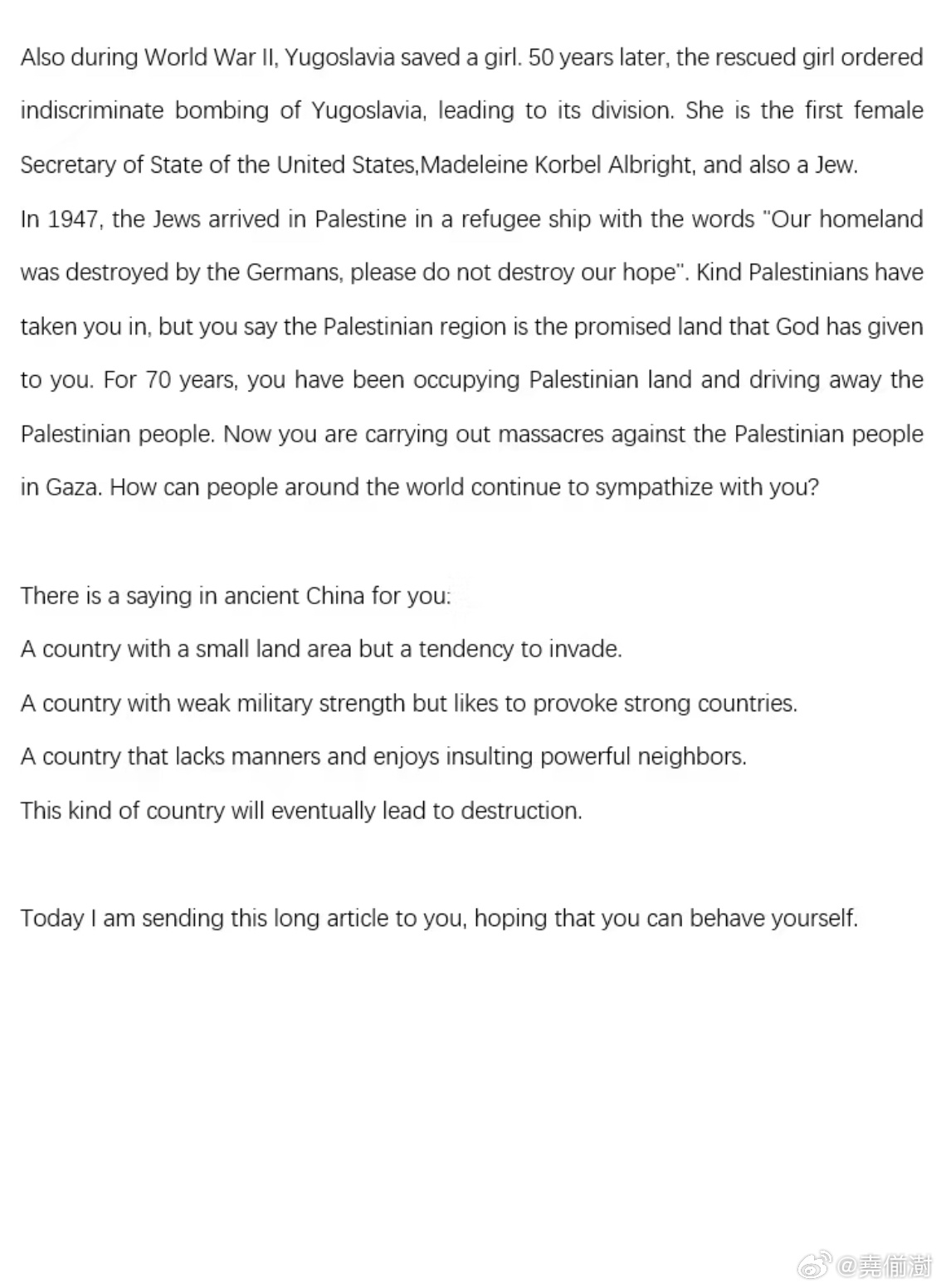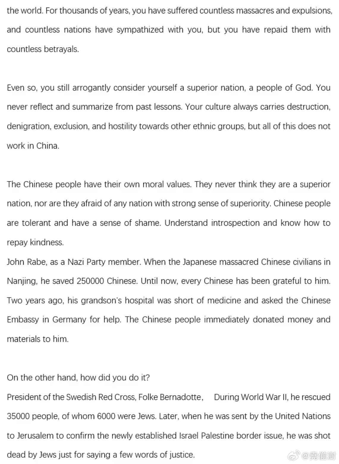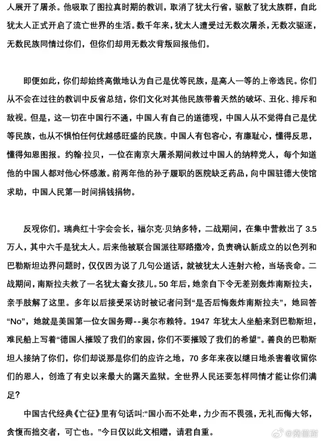 美国共和党前亚太区主席,以巴以冲突的相关话题,在头条上指责中国网友不同情犹太人的言论引起了热烈的讨论。一个中国网友看到后,引经据典,一口气写了一篇长文,给这位犹太裔美国共和党成员上了一堂历史课。然后,这个犹太共和党人偷偷删评了。巴以冲突美以伊最新局势