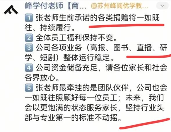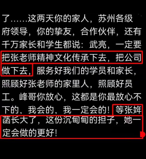 张雪峰去世头七这天,公司总经理武亮发了一篇长文悼念,里面不仅说了对公司未来的安排,还亲口透露了对张雪峰 11 岁女儿张姩菡的规划,更让人心里发酸的是,武亮在回复里说,已经把张雪峰生前常骑的那辆电瓶车仔细擦拭干净,好好保存起来了。 先说说公司未来的安排,这其实是所有人最担心的核心。张雪峰的公司太特殊,整个品牌几乎和他个人绑定,全网四千多万粉丝,业务从高考志愿填报到考研咨询,核心信任都来自他本人。 他一走,用户怕服务断档退费难,员工怕饭碗不保,合作方怕项目黄了。 武亮的表态没说空话,直接亮明了关键信息:业务正常推进,2026届的志愿填报服务按计划交付,研途的考研公考课程也不停课。 更实在的是,公司账上的资金够支付两百名员工半年工资,现金流充足,这就给团队和用户吃了颗定心丸。 但这背后的挑战没人回避,公司成也张雪峰,败也张雪峰。之前巅峰时期,三小时能卖两万单志愿填报服务,入账两亿,利润率高达七成,可这些都依赖他的个人影响力。 现在武亮要做的,就是把“张雪峰”这个个人IP,慢慢转化成标准化的服务体系。 他们已经开始动作,把张雪峰的志愿填报方法论、专业判断整理成SOP,批量培养规划师,直播也从个人出镜改成团队上阵。 短期要稳住今年的高考季,保住现金流和口碑,长期则要搭建产品化、体系化的平台,摆脱对单一IP的依赖。苏州园区和相关部门也表态支持,加上核心教研团队没散,短期的稳定基本没问题,但长期转型能不能成,还要看后续的执行力度。 再看对张雪峰11岁女儿张姩菡的规划,这部分最让人觉得暖心。武亮没说什么宏大的承诺,却把张雪峰生前的用心都延续了下来。 张姩菡这个名字是张雪峰翻了半年字典取的,谐音“念寒”,既念东北老家,也念自己名字里的“雪峰”,满是父爱。 张雪峰生前早就为女儿铺好了路,注册了近四十个相关商标,覆盖教育、医药等多个领域,还规划了国际学校到香港或新加坡留学的路径,甚至说过“赚够了一辈子的钱,不用她卷”。 武亮的规划没有偏离这些,明确说会照顾好张雪峰的家人,社交媒体账号不会关停,未来会交到张姩菡手里,还计划出版张雪峰的传记,每年他的生日和忌日公司会放假,让员工去看望。 这不仅仅是照顾,更是对逝者遗愿的尊重。11岁的孩子突然失去父亲,最需要的就是稳定和延续,武亮的安排既守住了张雪峰对女儿的“兜底式父爱”,也让这个承载着父亲期望的孩子,未来有了明确的方向。 而且从公司层面看,保留与张雪峰家人的联结,也是在传递一种信号:这家公司不会因为创始人的离开就切断过去,品牌的精神内核会一直延续。 最让人心里发酸的,还是那辆被仔细擦拭保存的电瓶车。这辆车太有代表性了,张雪峰早就实现了财富自由,却骑了三年多,每天上下班、接女儿放学都靠它。 苏州的路不算宽,他总说骑电动车方便,还能看看路边的烟火气,车把上还挂着女儿选的小挂件。 下雨天他穿着雨衣骑车接女儿,自己半个身子淋在雨里,就怕孩子受凉。武亮把这辆车保存下来,不是做表面文章,而是留住了张雪峰最真实的样子。 他不是什么高高在上的老板,而是一个接地气、重生活的普通人。这辆车见证了他对女儿的陪伴,也见证了他踏实做事的态度。 对公司员工来说,看到这辆车就像看到张雪峰还在一样,能稳住人心;对关注他的人来说,这是一种情感寄托,提醒大家那个总说大白话、帮普通家庭打破信息差的张雪峰,从未被忘记。这种纪念方式,比任何华丽的辞藻都有力量,既朴素又深沉。 武亮的这篇长文,其实构建了三个层次的守护:守护公司的存续,让上百名员工有饭吃、千万用户的服务不中断;守护逝者的家人,让孩子能在父亲铺好的路上安心成长;守护逝者的精神,用一辆电瓶车、一套未完成的规划,留住那些最珍贵的品质。 他能这么做,也和他与张雪峰的关系分不开。武亮不是空降的高管,是从宁夏分公司的基层咨询师一步步做起来的,被张雪峰调到身边亲自培养,两人甚至能半年不做正式汇报,信任早已超出普通的上下级。 张雪峰生前公开说要让武亮三年内在苏州买房买车,武亮也用每天十六小时的工作回报这份信任,负责后端流量承接和业务分层,成了张雪峰最得力的左膀右臂。现在他扛起重任,每一个安排都既考虑实际,又饱含情感。既没有因为悲伤而乱了阵脚,也没有因为现实压力而忽略人情。 说到底,这篇长文之所以能引发广泛共鸣,就是因为它真实。没有官话套话,没有空洞的承诺,每一个安排都落到了实处,每一个细节都藏着温度。 公司的规划关乎生存,女儿的未来关乎传承,电瓶车的保存关乎纪念,三者交织在一起,既稳住了当下,也照亮了未来。 这不仅是对张雪峰最好的告慰,也让大家看到,真正的情谊和责任,不会随着生命的逝去而消失,反而会在传承中变得更加坚定。