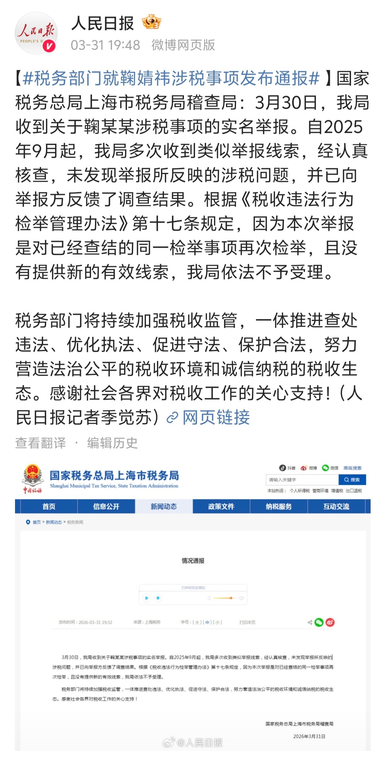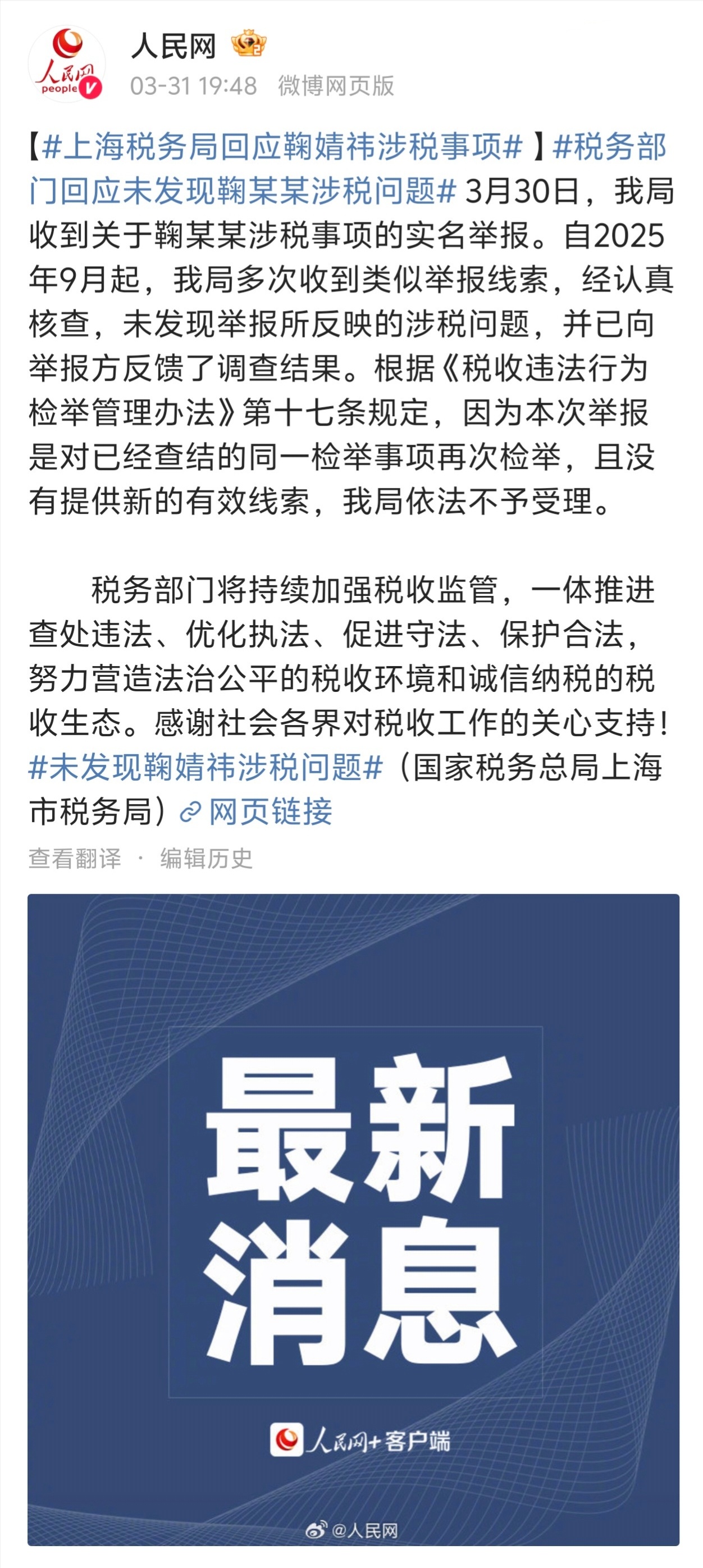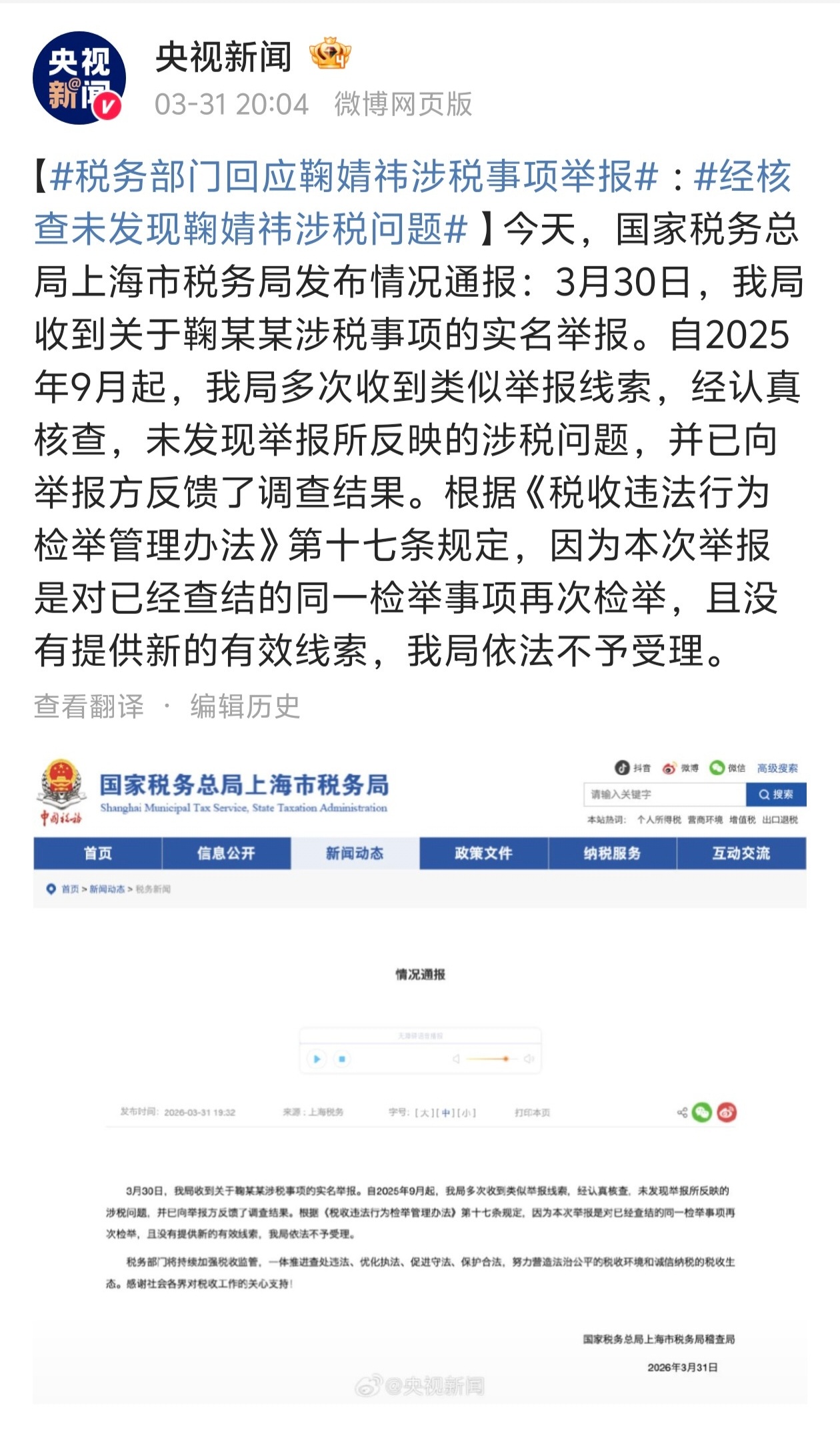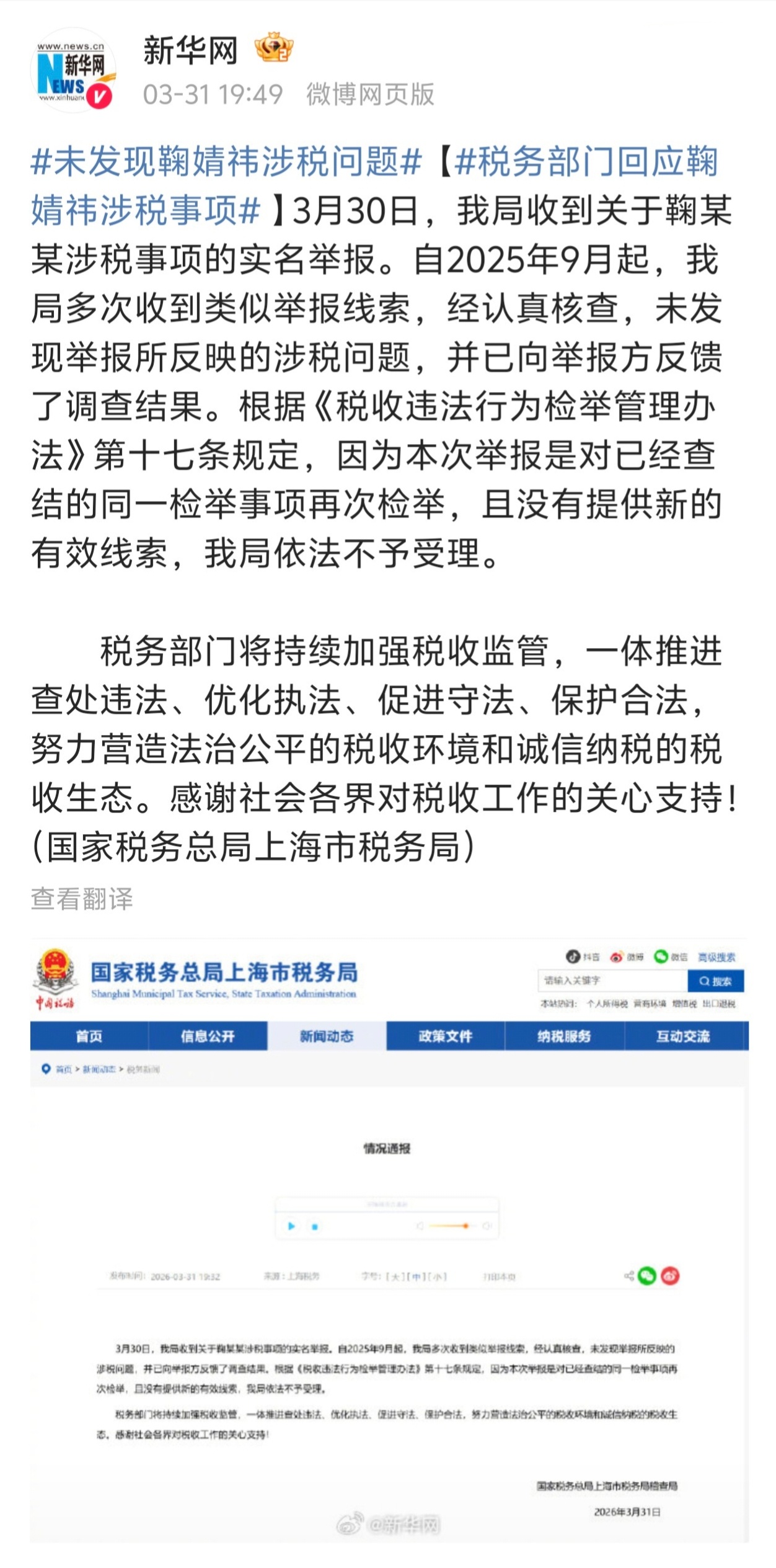 未发现鞠婧祎涉税问题 新华社、新华网、人民网、人民日报、央视新闻......