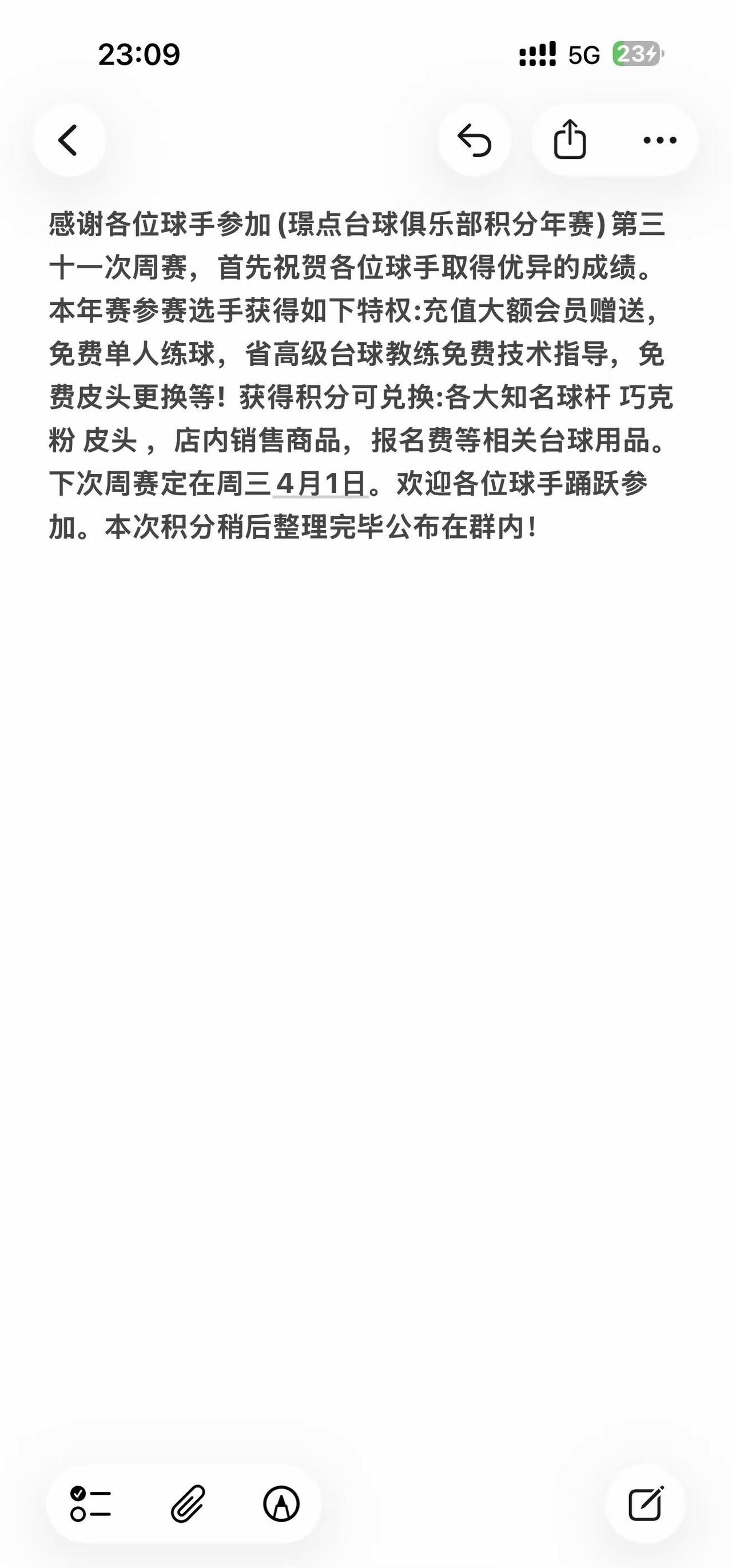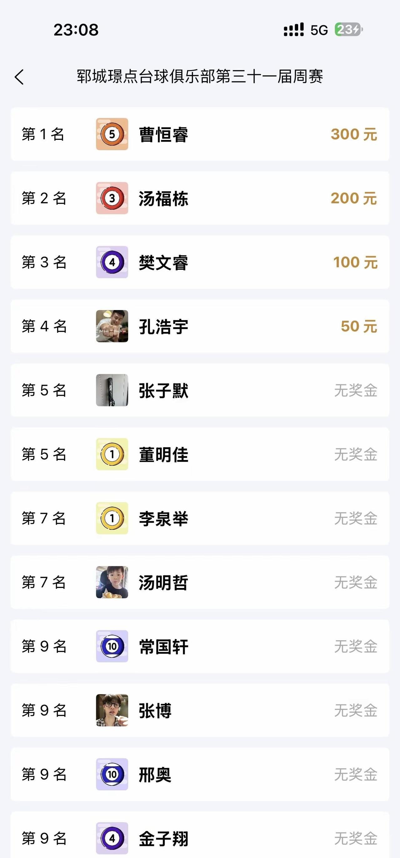 2026年03月28日,郓城璟点台球俱乐部中式台球积分周赛,本次赛事吸引了郓城30名余名运动员积极参与,共进行了50余场的激烈争夺,最终圆满成功!获得本次赛事:冠军🏆: 曹恒睿亚军🏆: 汤福栋季军🏆: 樊文睿殿军🏆: 孔浩宇🎊🎊🎊恭喜🎊🎊🎊以上获奖选手,感谢各参赛选手的积极参与,我们期待下次相聚