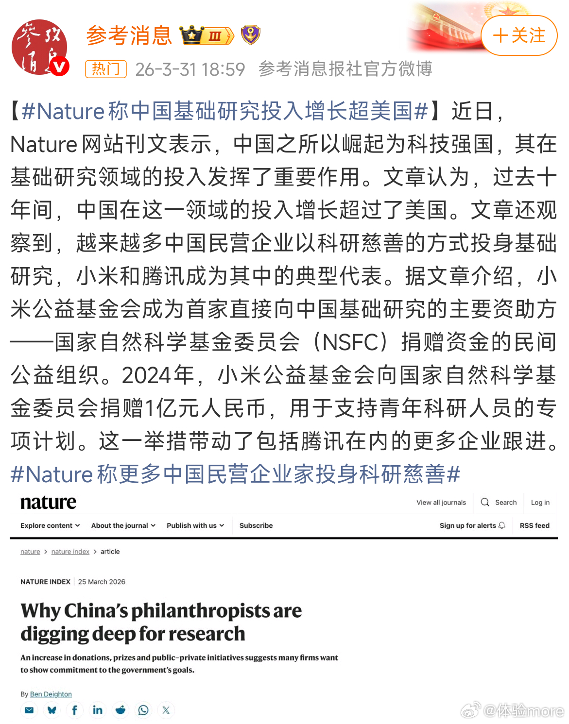 Nature这篇文章还提到了越来越多中国民营企业以科研慈善的方式投身基础研究,比如小米和腾讯。