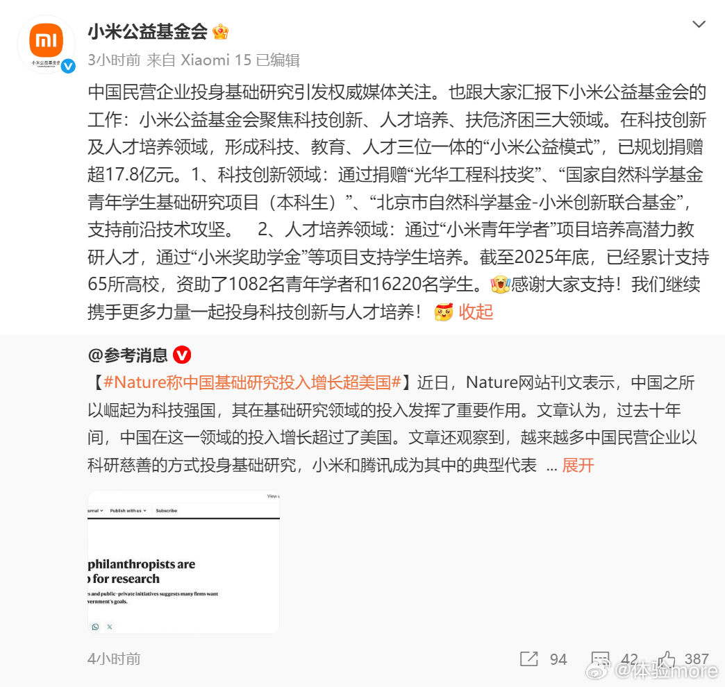 小米公益基金会是首家直接向国家自然科学基金委员会捐赠资金的民间公益组织,仅2024年就捐赠1亿元人民币。之前总是看到小米公益基金会抗震救灾捐款,没想到在人才培养和教育上也捐赠那么多,这才是一家企业的社会责任感啊。