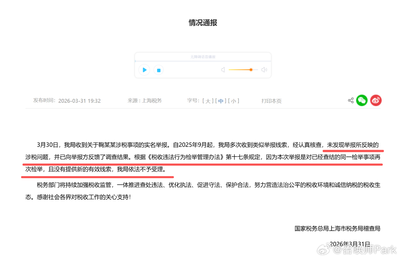有点尴尬,丝芭刚刚三问鞠婧祎,就看到税务部门回应鞠婧祎涉税事项:从去年9月就开始收到线索,认真核查后未发现鞠婧祎涉税问题,这次又检举,且没有提供新的有效线索,依法不受理!