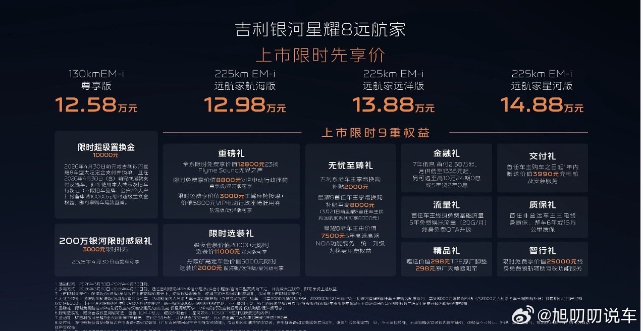 吉利银河又来搞事情了!3月30日,星耀8远航家系列上新,三个225km纯电续航版本限时12.98万-14.88万开卖,直接把中高级插混轿跑的门槛砸到了12.58万起。