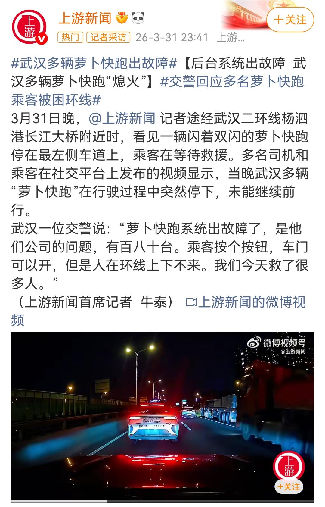 武汉多辆萝卜快跑出故障! 萝卜快跑突然出现了系统性故障,直接在路上停下来了并打开双闪,也有不少车因为避闪不及直接追尾了萝卜快跑的车辆。 萝卜快跑是无人出租车,车上并没有实际的司机,出现这个情况之后,很多乘客只能打电话求助,因为很多车辆是在环线上。 目前萝卜快跑公司还没有发布正式的公告,说明此次大规模故障的原因。根据初步测算,可能有100台以上的车辆发生了类似的事情。 各位是怎么看的?欢迎评论区留言。